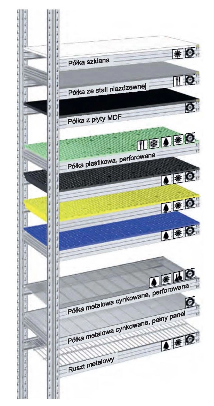Półki mogą być wykonane z różnych materiałów, co wpływa na ich zastosowanie:
