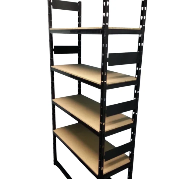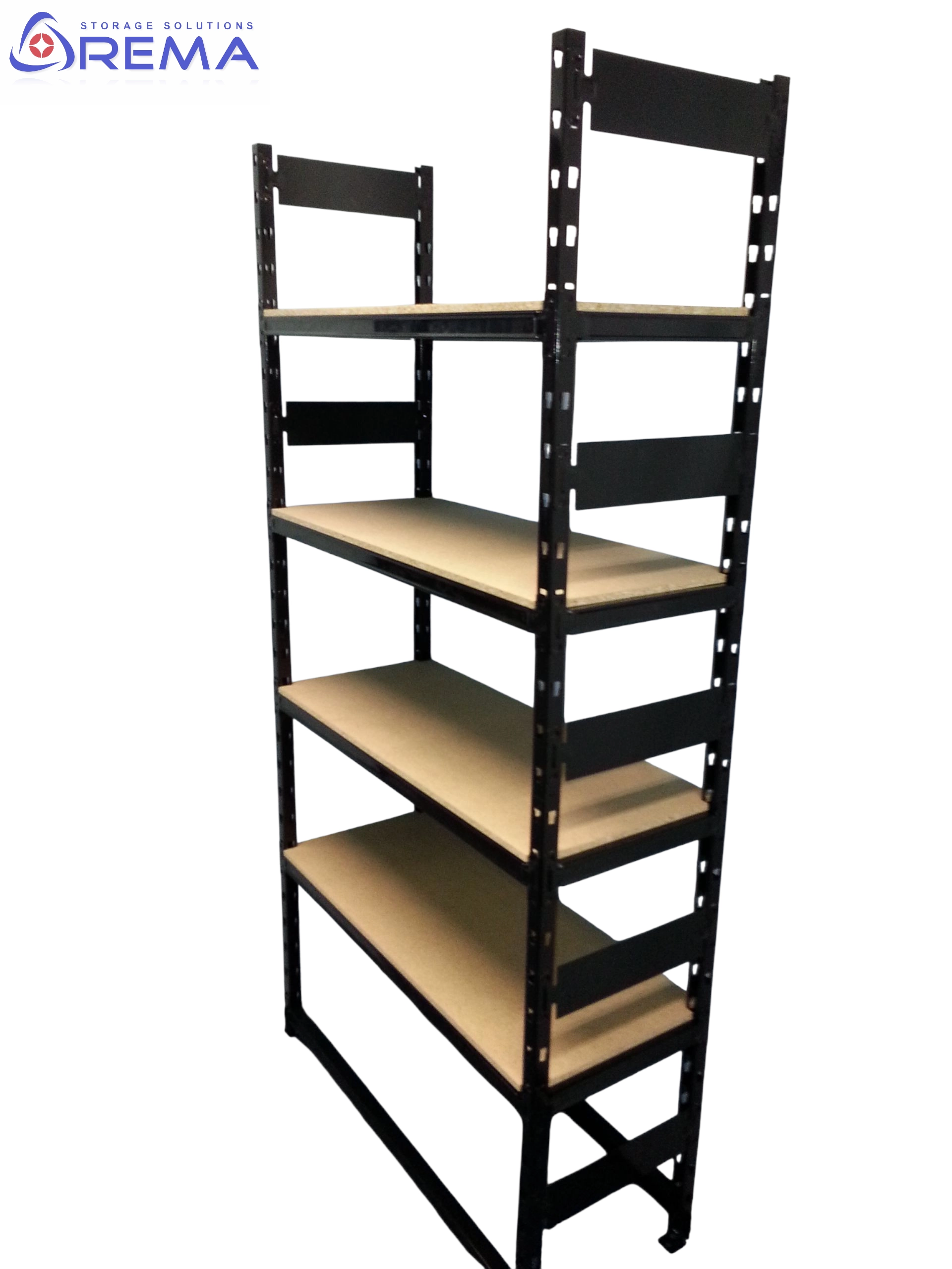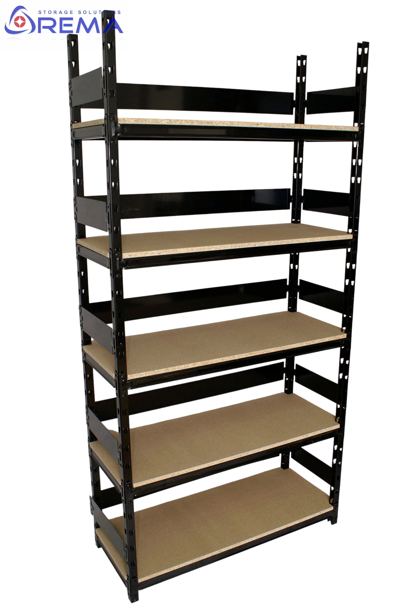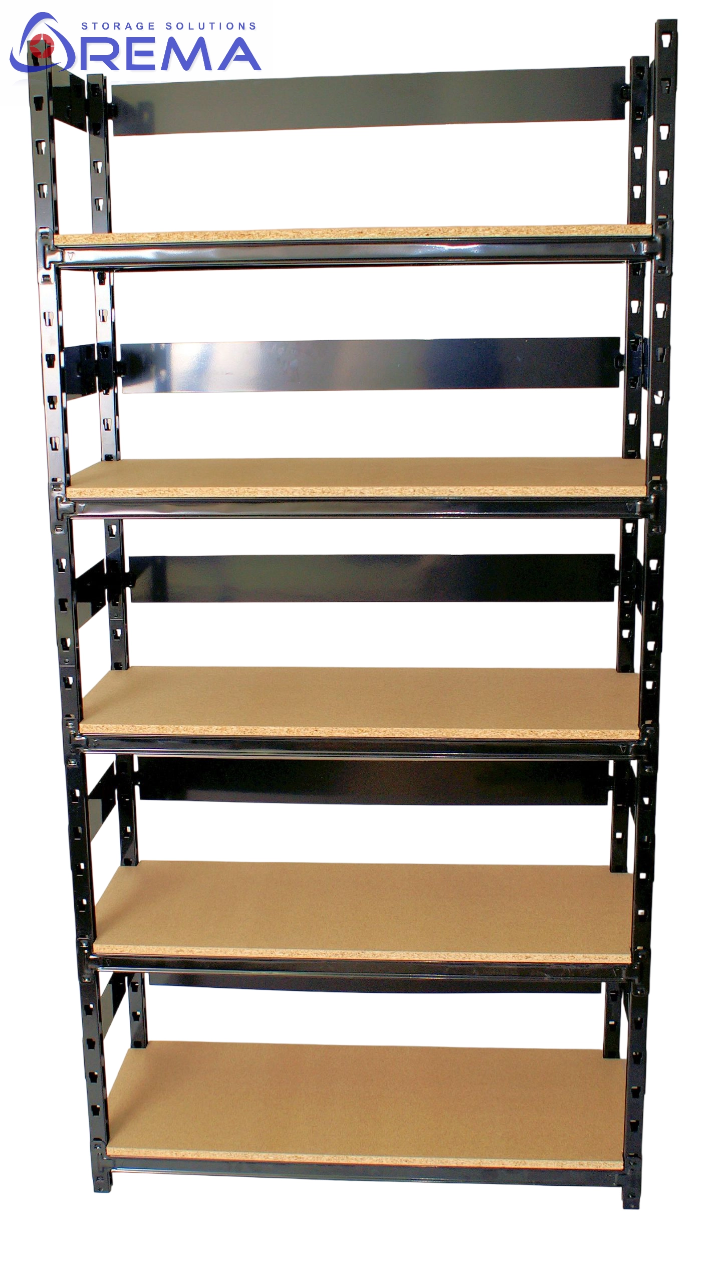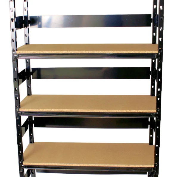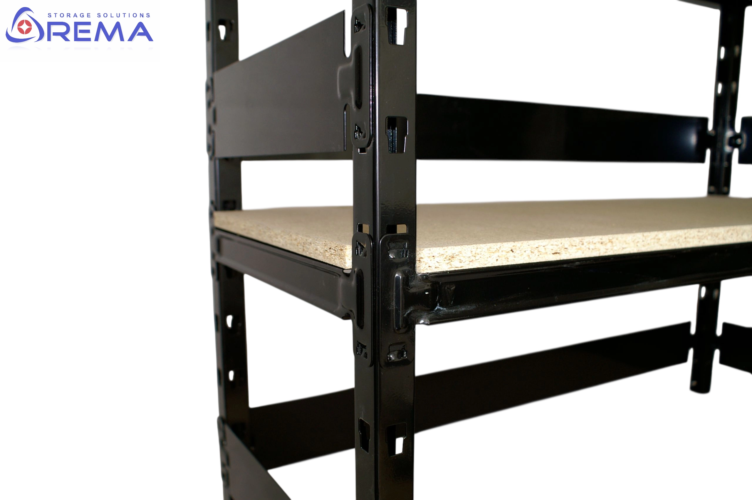 Nośność półki: 220 kg – półki wykonane z płyty wiórowej surowej lub laminowanej w kolorze białym, o grubości 18 mm, osadzone na stalowych stelażach,
