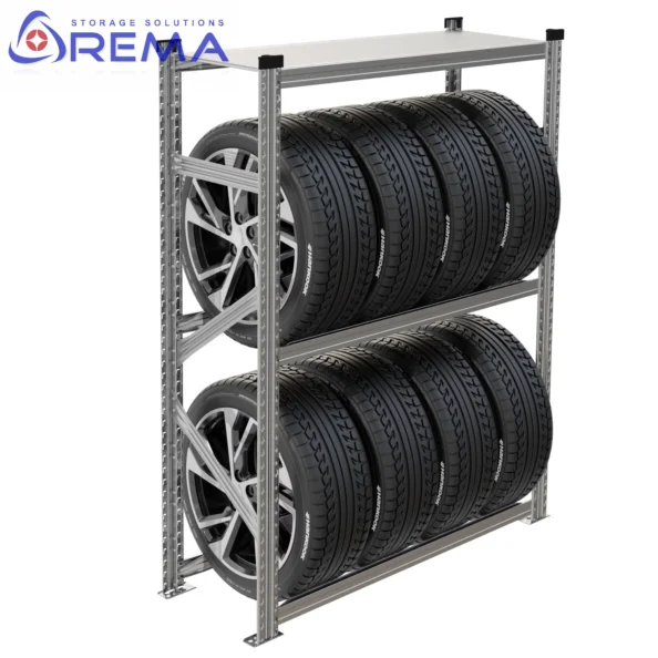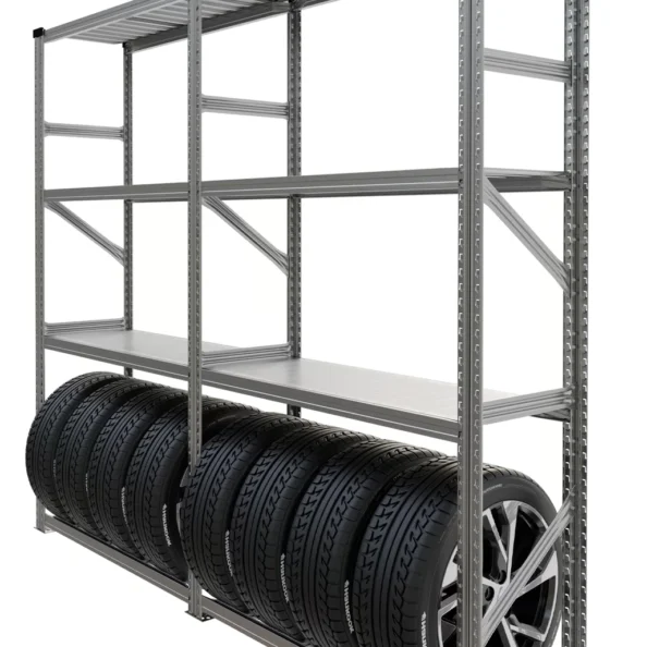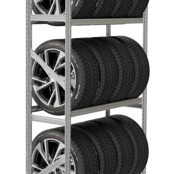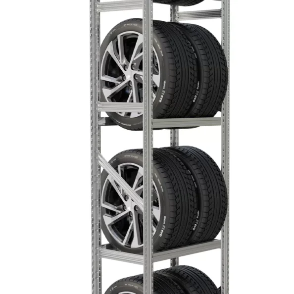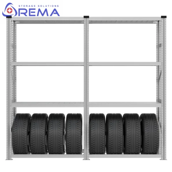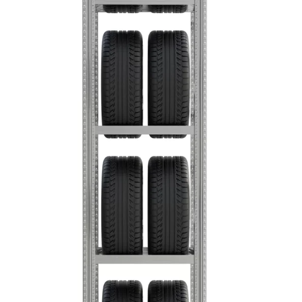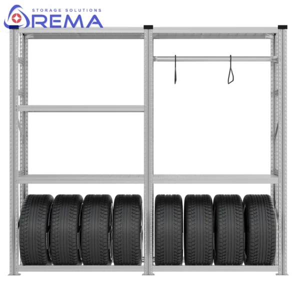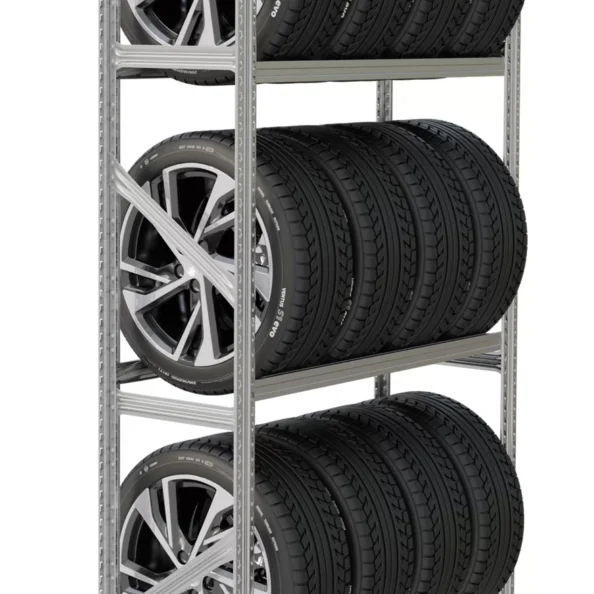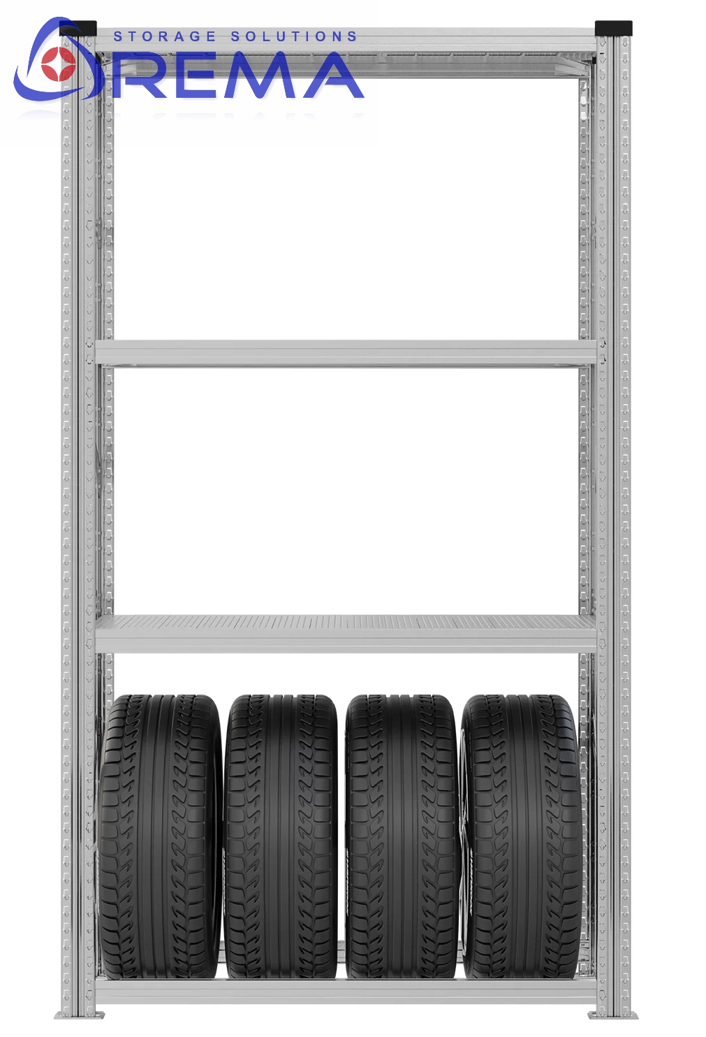 Regał jednostronny na 2 komplety opon + 3 półki stalowe – idealny dla użytkowników domowych.