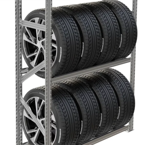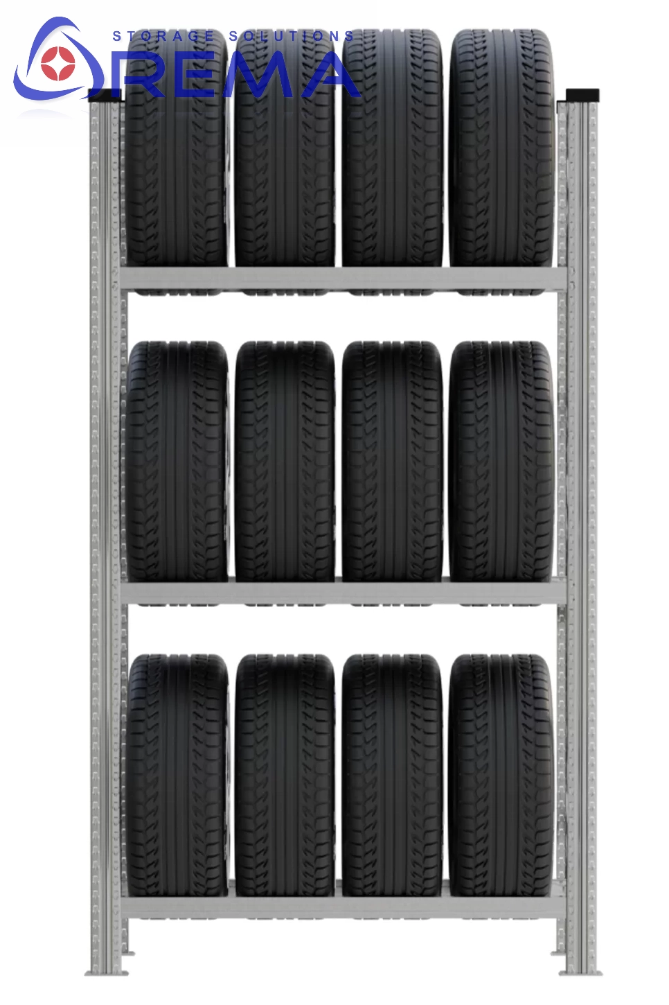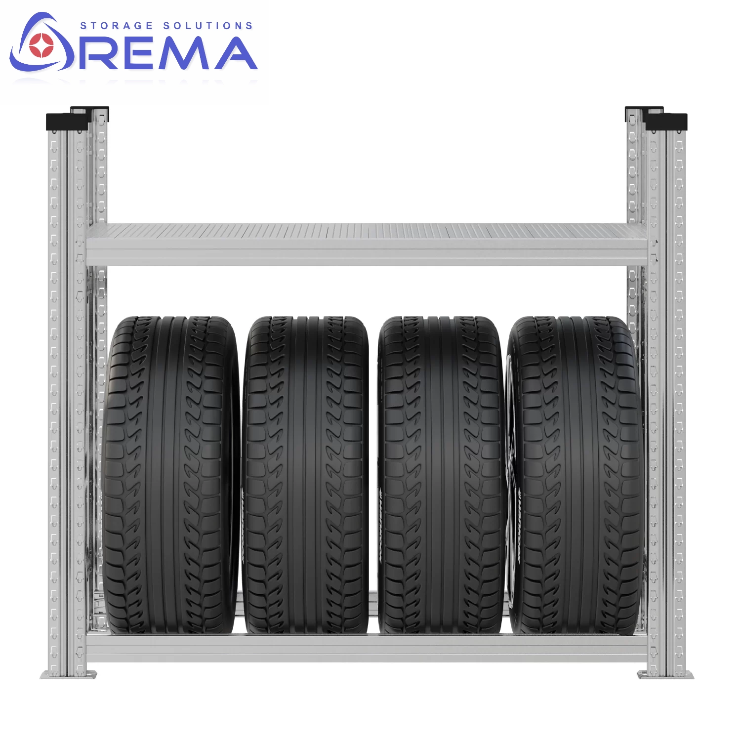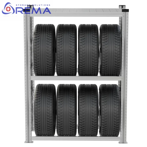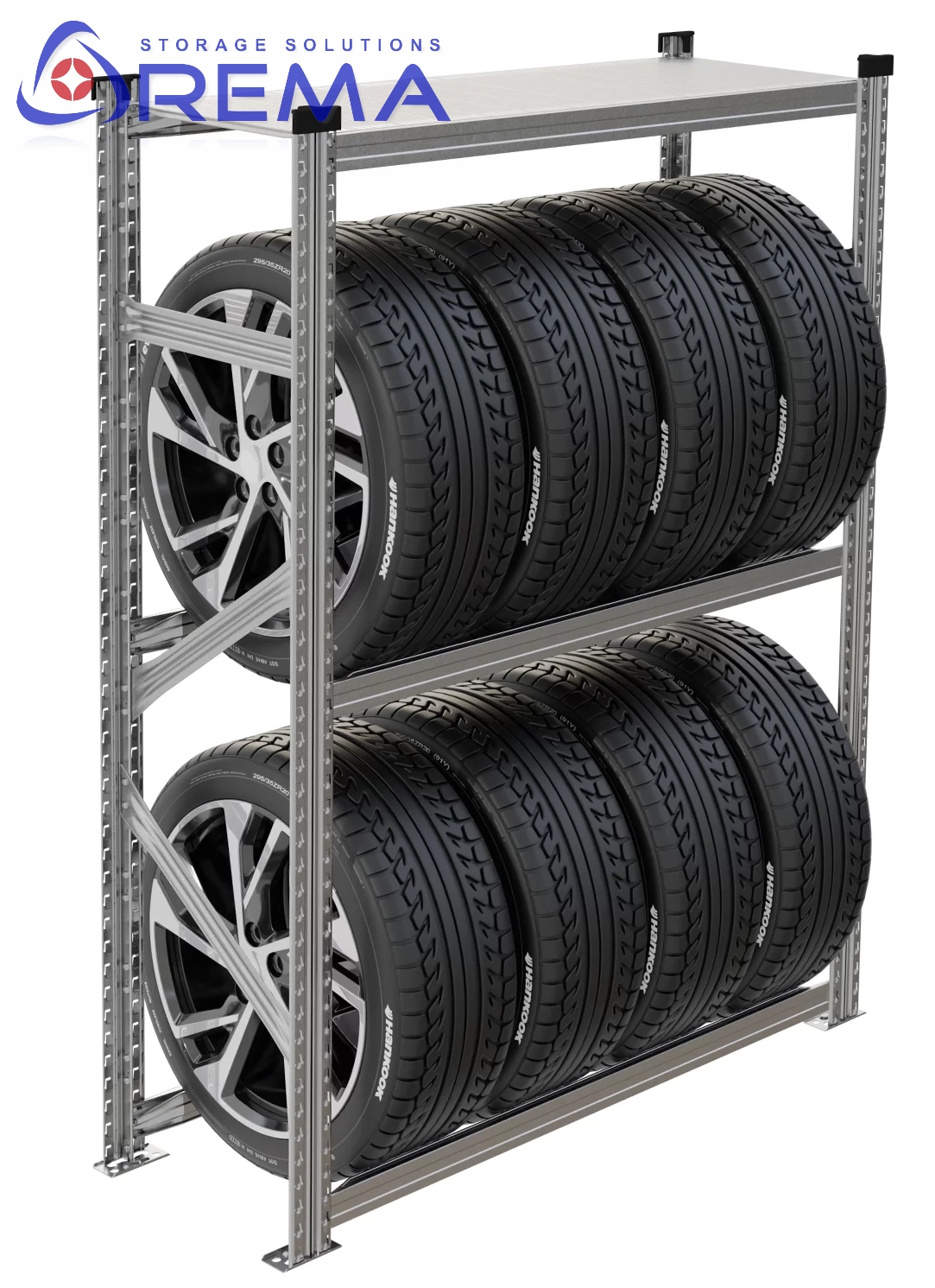 Regał jednostronny na 2 komplety opon + 3 półki stalowe – idealny dla użytkowników domowych.