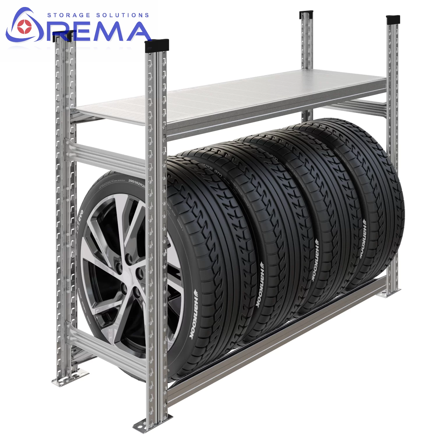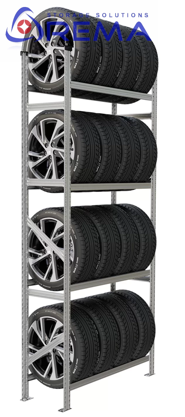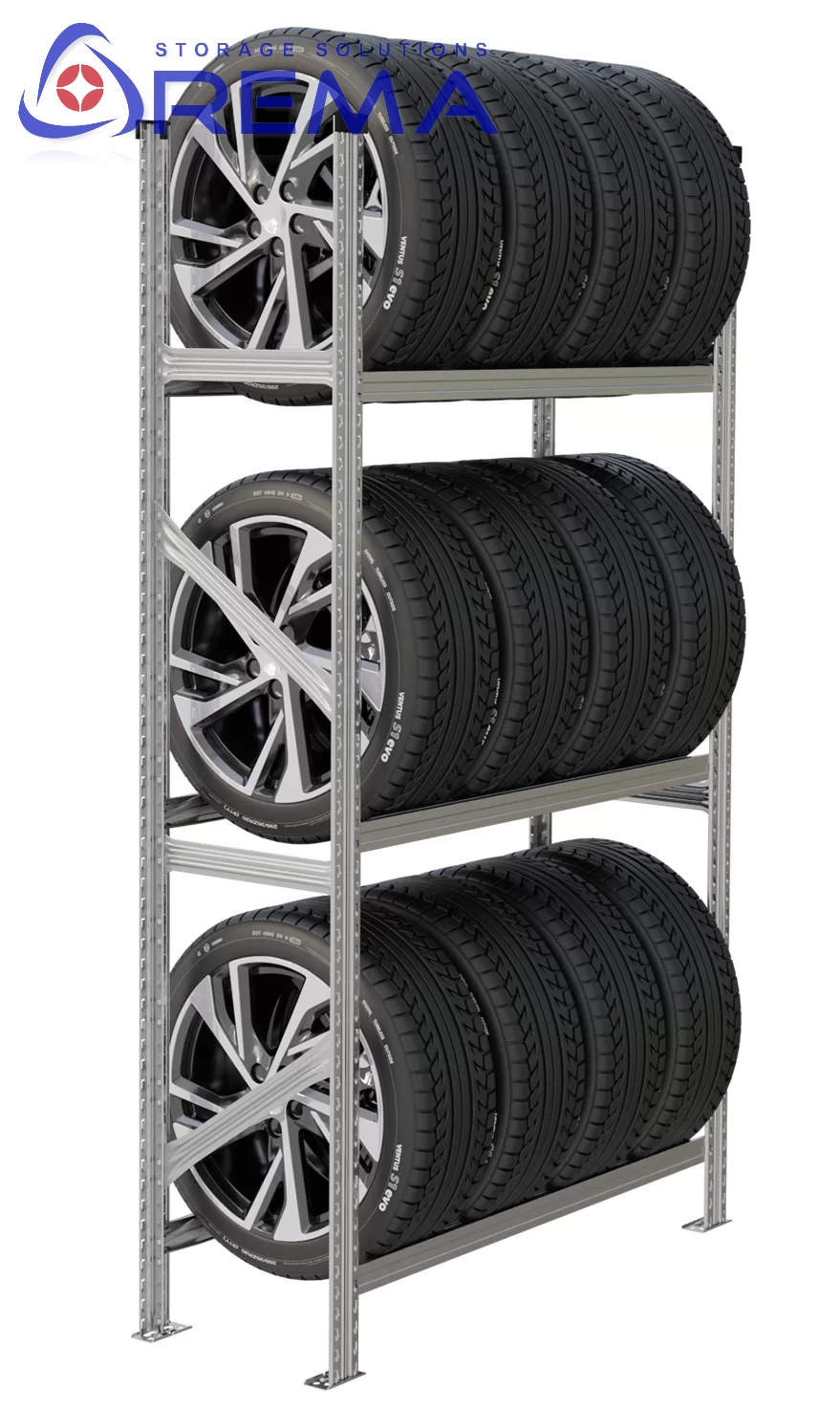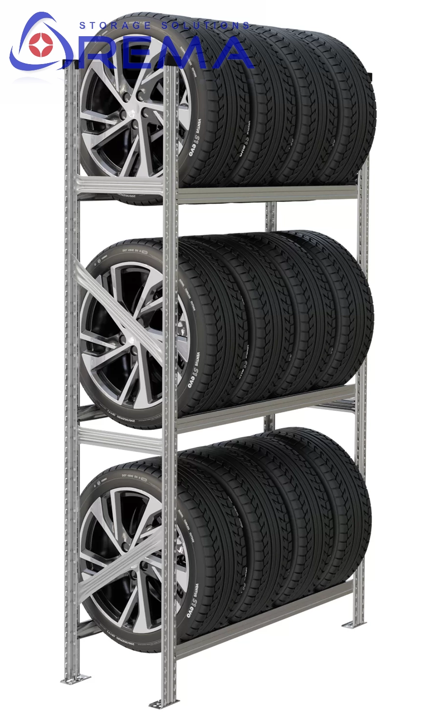 Regał jednostronny na 2 komplety opon + 3 półki stalowe – idealny dla użytkowników domowych.