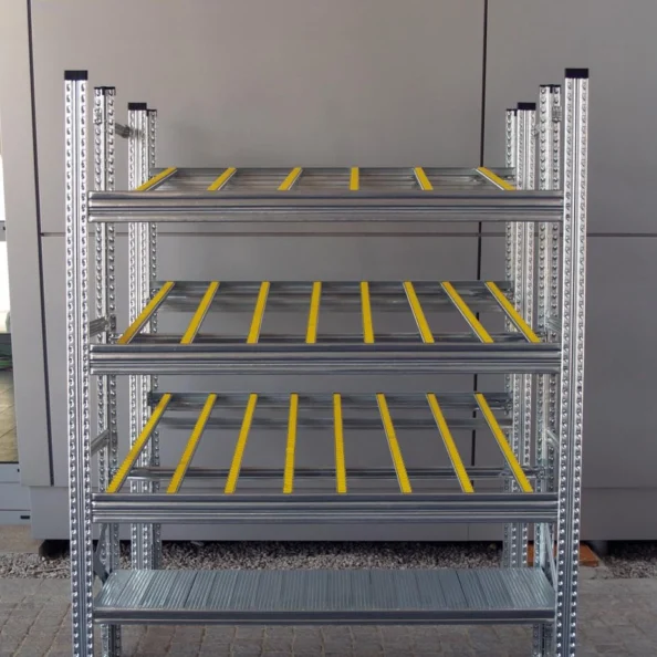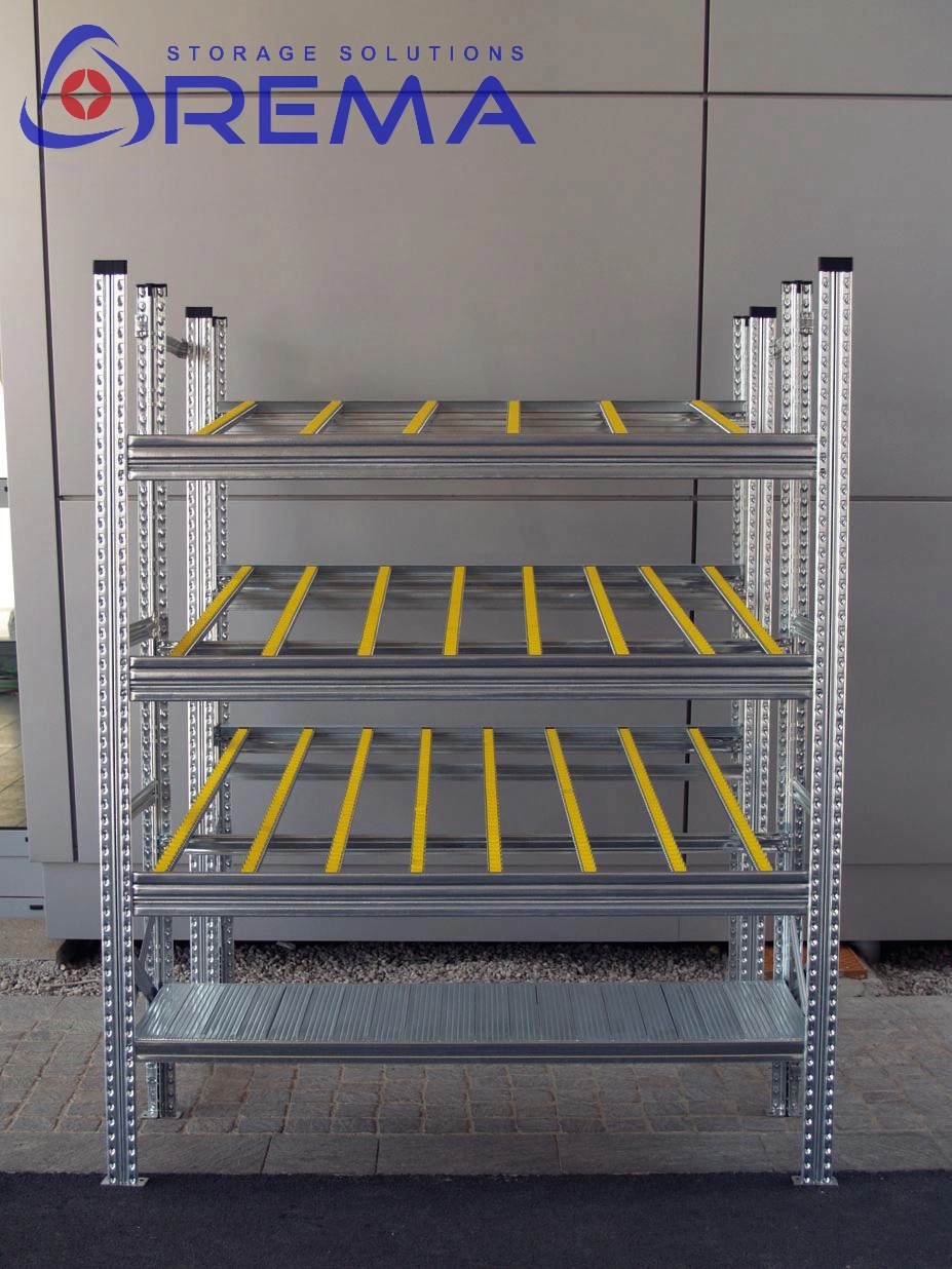 System bazuje na stalowej, ocynkowanej konstrukcji (typ SU) i modułowych torach rolkowych przystosowanych do kształtu opony. Regał grawitacyjny można dowolnie rozbudowywać, łączyć w ciągi oraz doposażać w akcesoria (prowadnice, odboje, separatory).