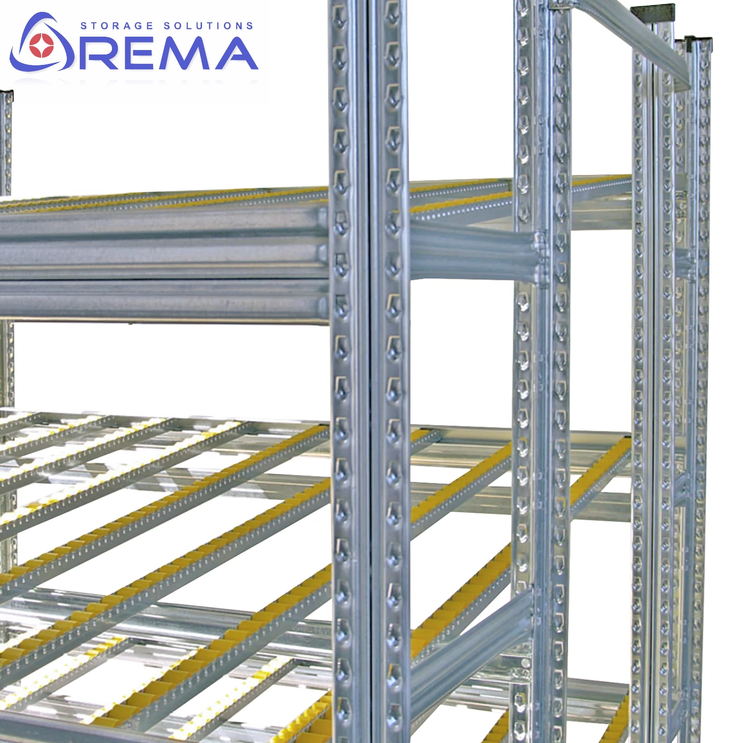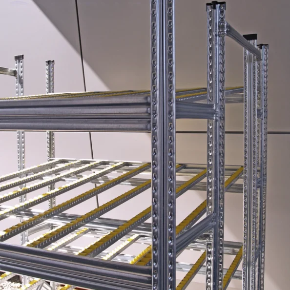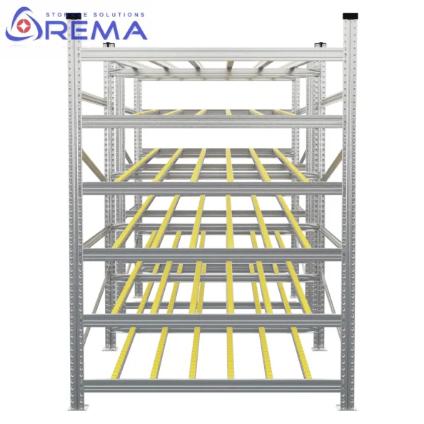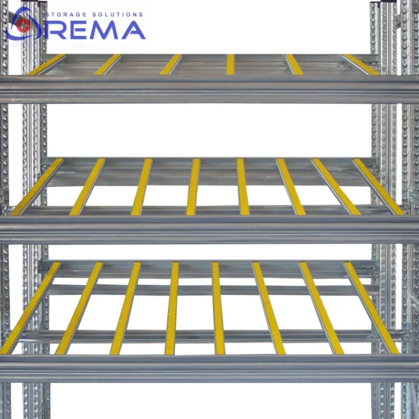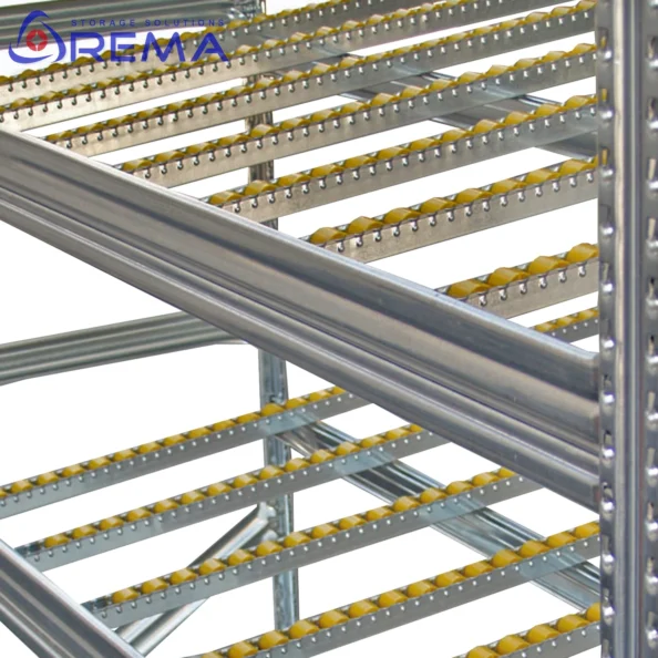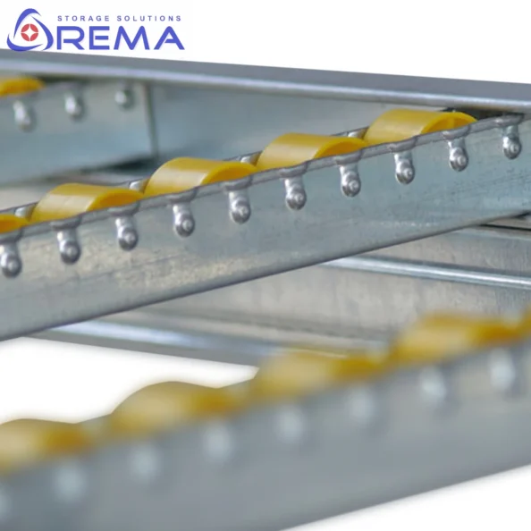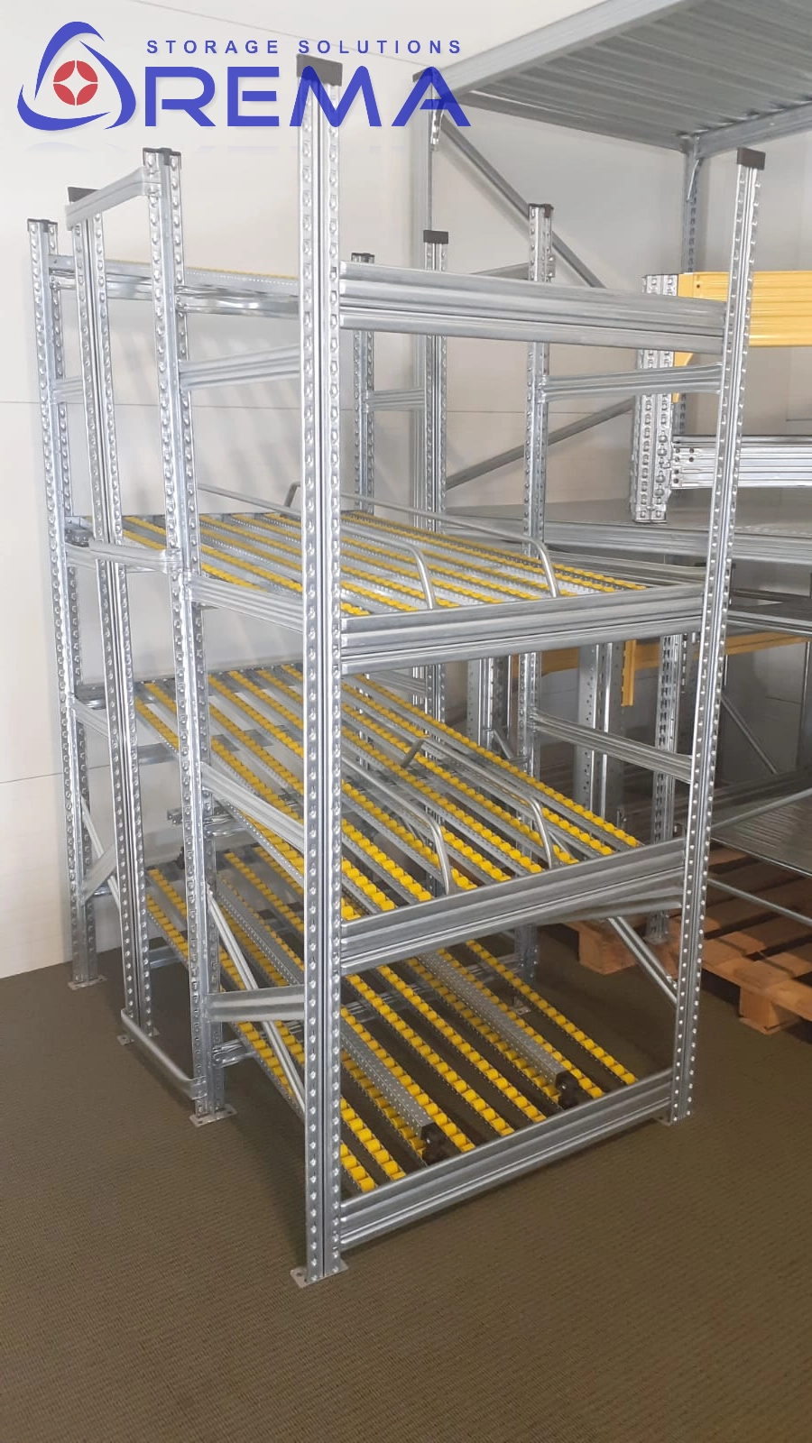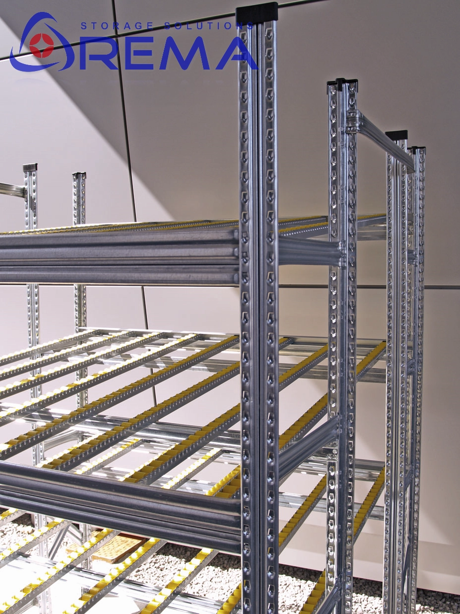 Regały grawitacyjne REMA wykonywane są z wysokowytrzymałej stali ocynkowanej, która zapewnia odporność na uszkodzenia mechaniczne i korozję.