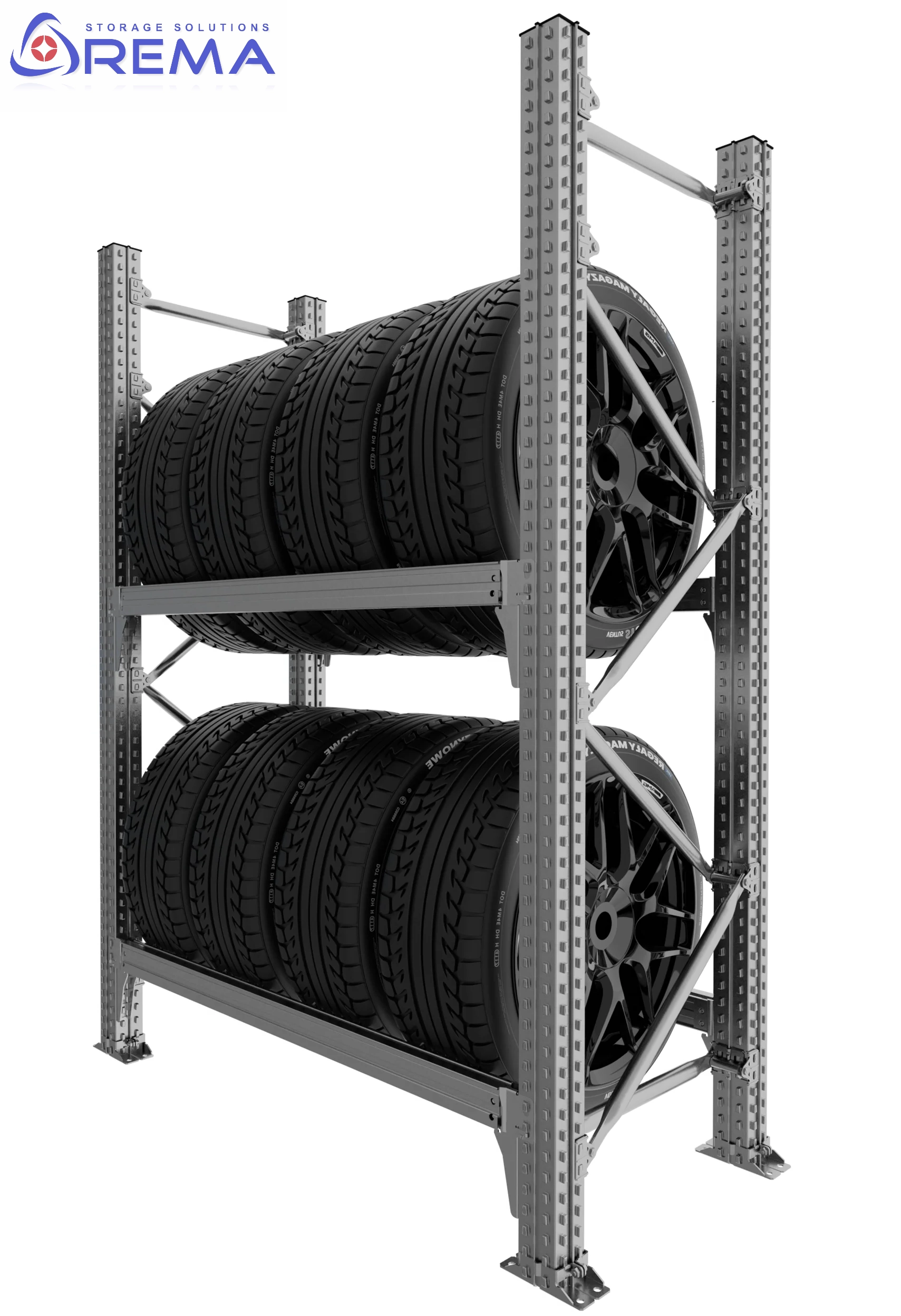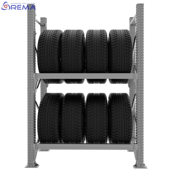 Każdy poziom półki można regulować co 33 mm, co pozwala idealnie dopasować przestrzeń do wymiarów opon. Dzięki temu konstrukcja jest maksymalnie elastyczna i może być dostosowana do różnych zastosowań – od opon osobowych po ciężarowe.