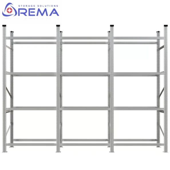 Dzięki systemowi modułowemu użytkownik ma możliwość rozbudowy regału o dodatkowe poziomy, półki lub akcesoria zwiększające jego funkcjonalność.