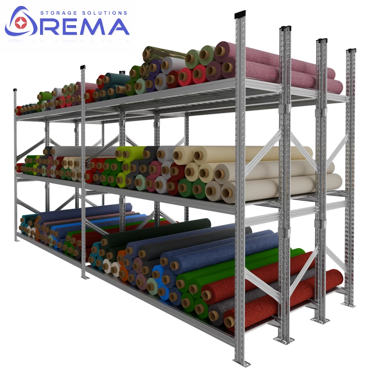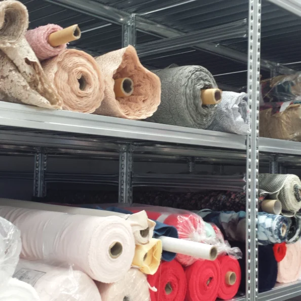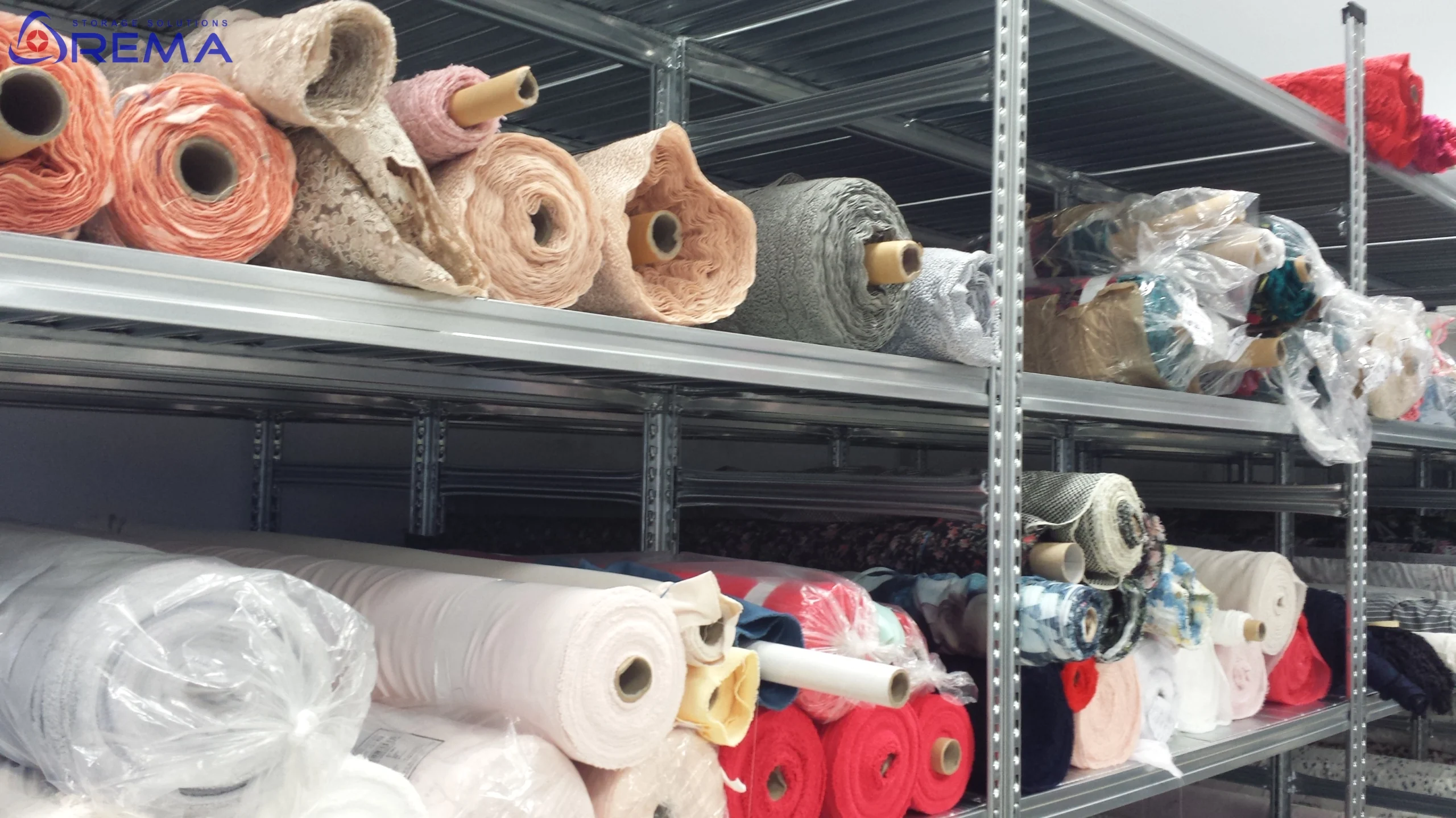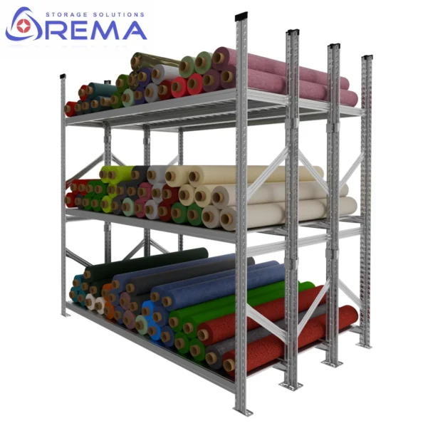 Każdy regał można też wyposażyć w dodatkowe belki poprzeczne, półki stalowe lub perforowane oraz listwy ochronne zabezpieczające dolne partie tkanin przed zabrudzeniem.