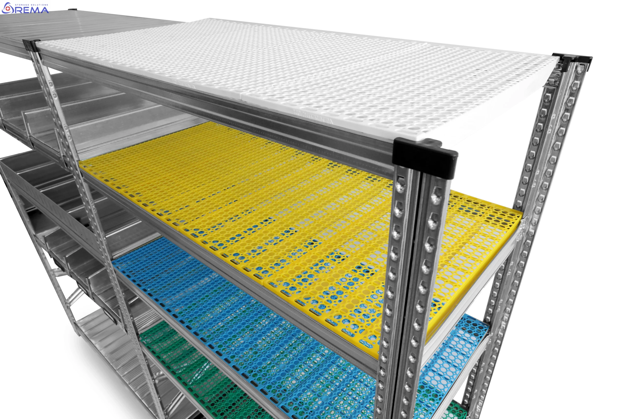 Lepsza cyrkulacja powietrza – otwory w półkach umożliwiają swobodny przepływ chłodnego powietrza, dzięki czemu produkty w chłodniach i mroźniach są równomiernie schładzane. To pozwala utrzymać stabilną temperaturę przechowywania na wszystkich poziomach regału.