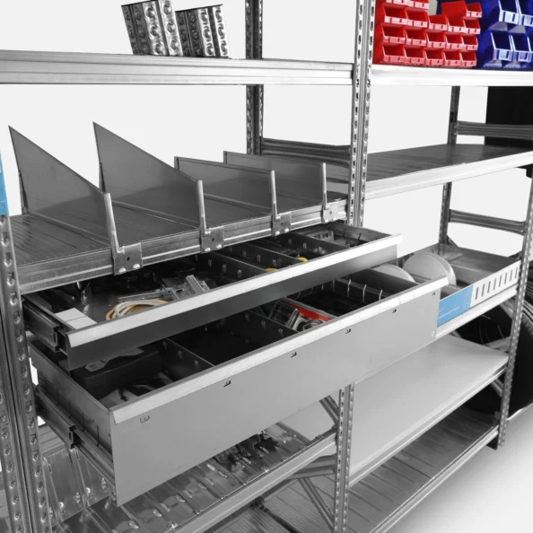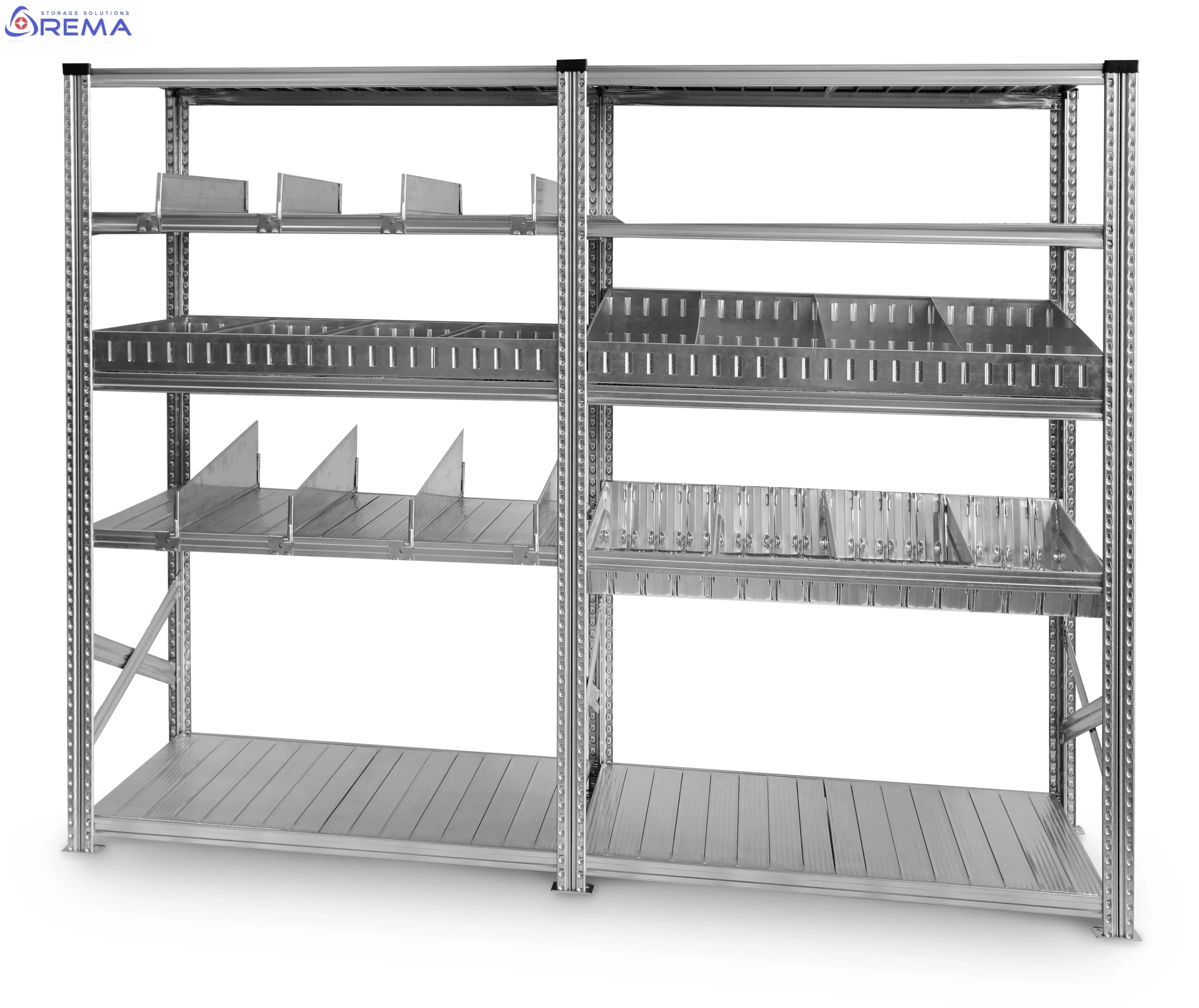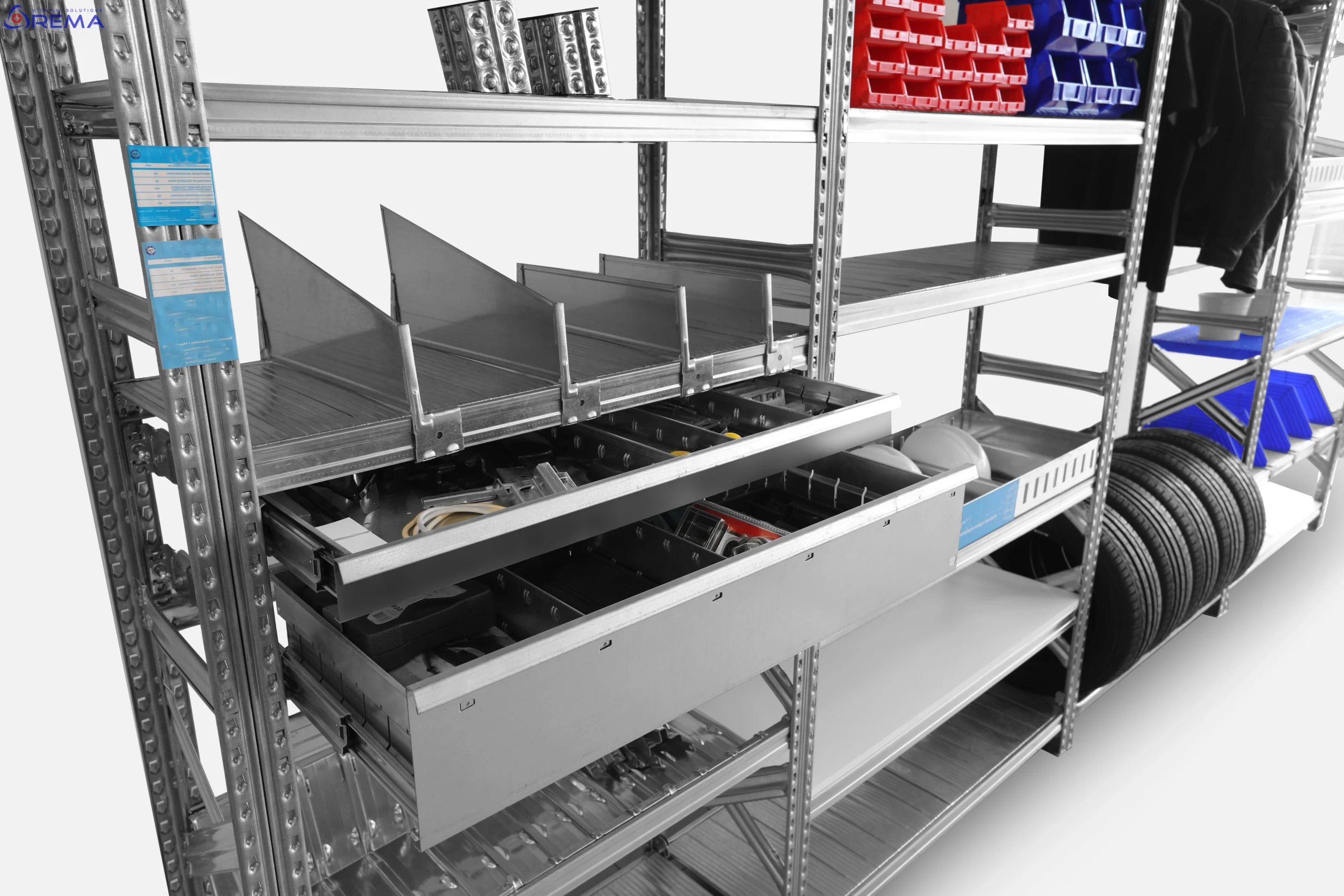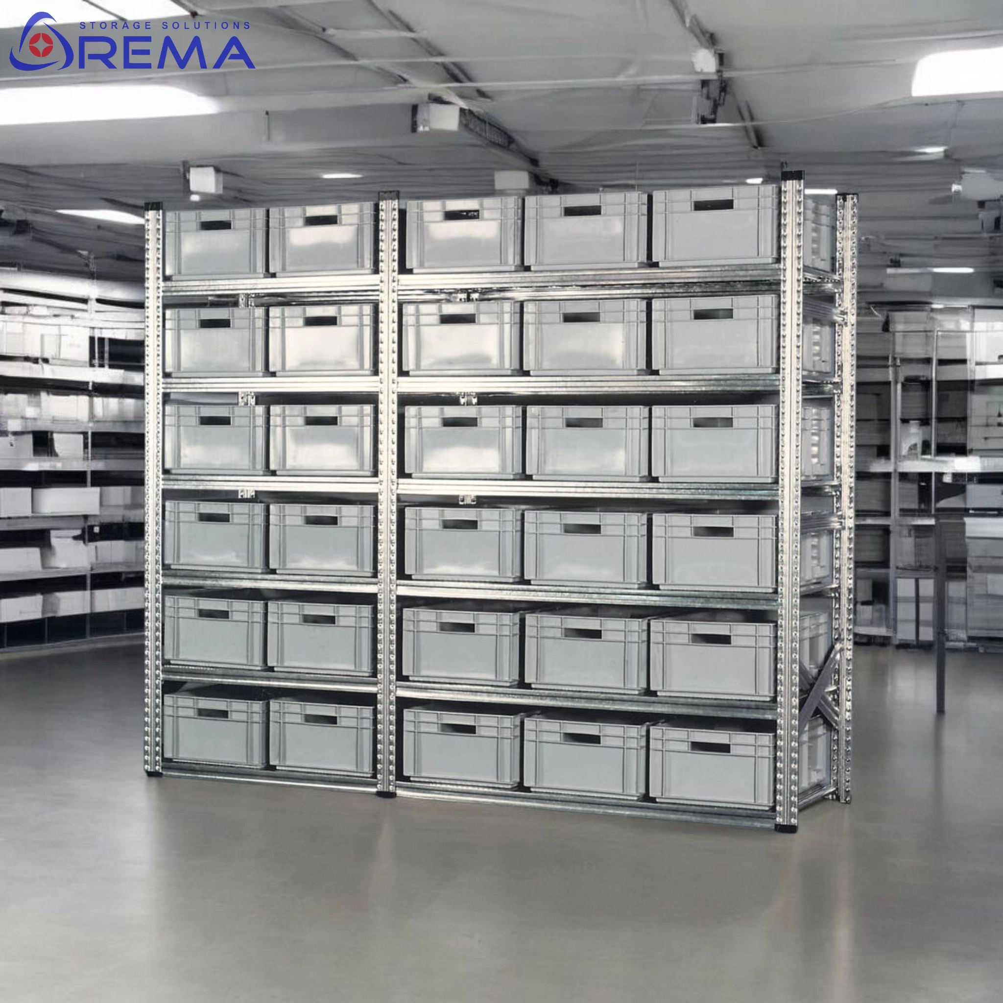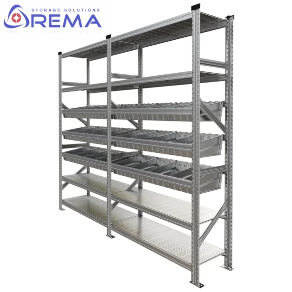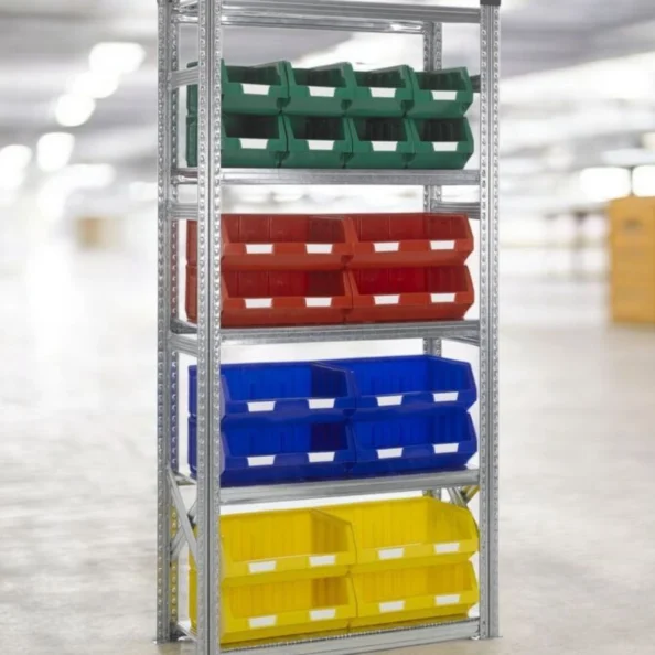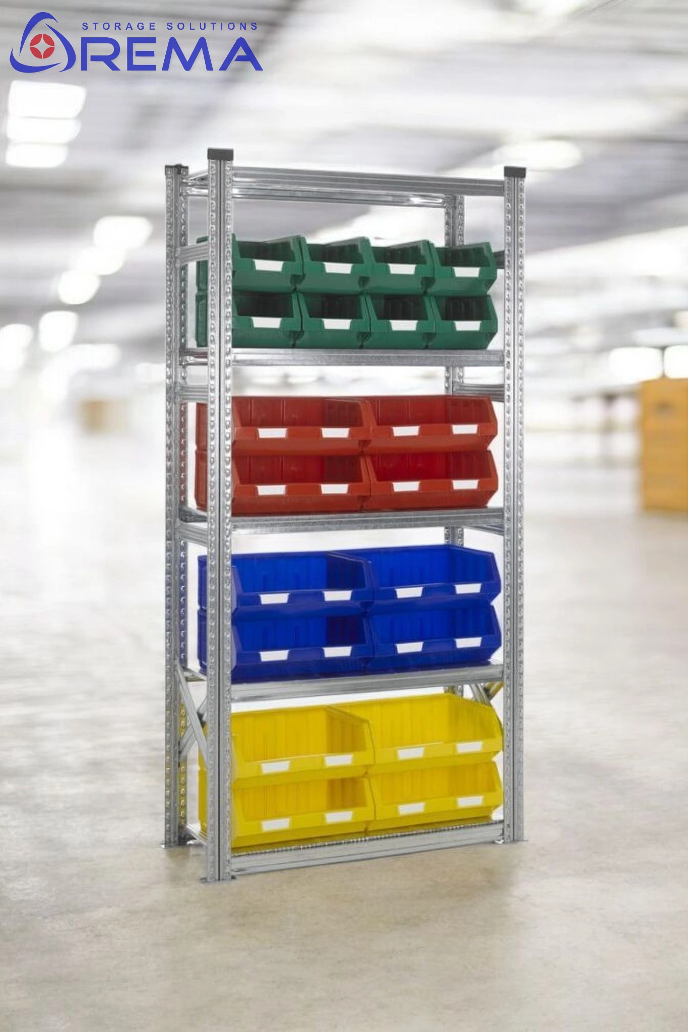 półki pojemnikowe i kontenerowe – do segregacji drobnicy – regał z pojemnikami, regał na pojemniki,