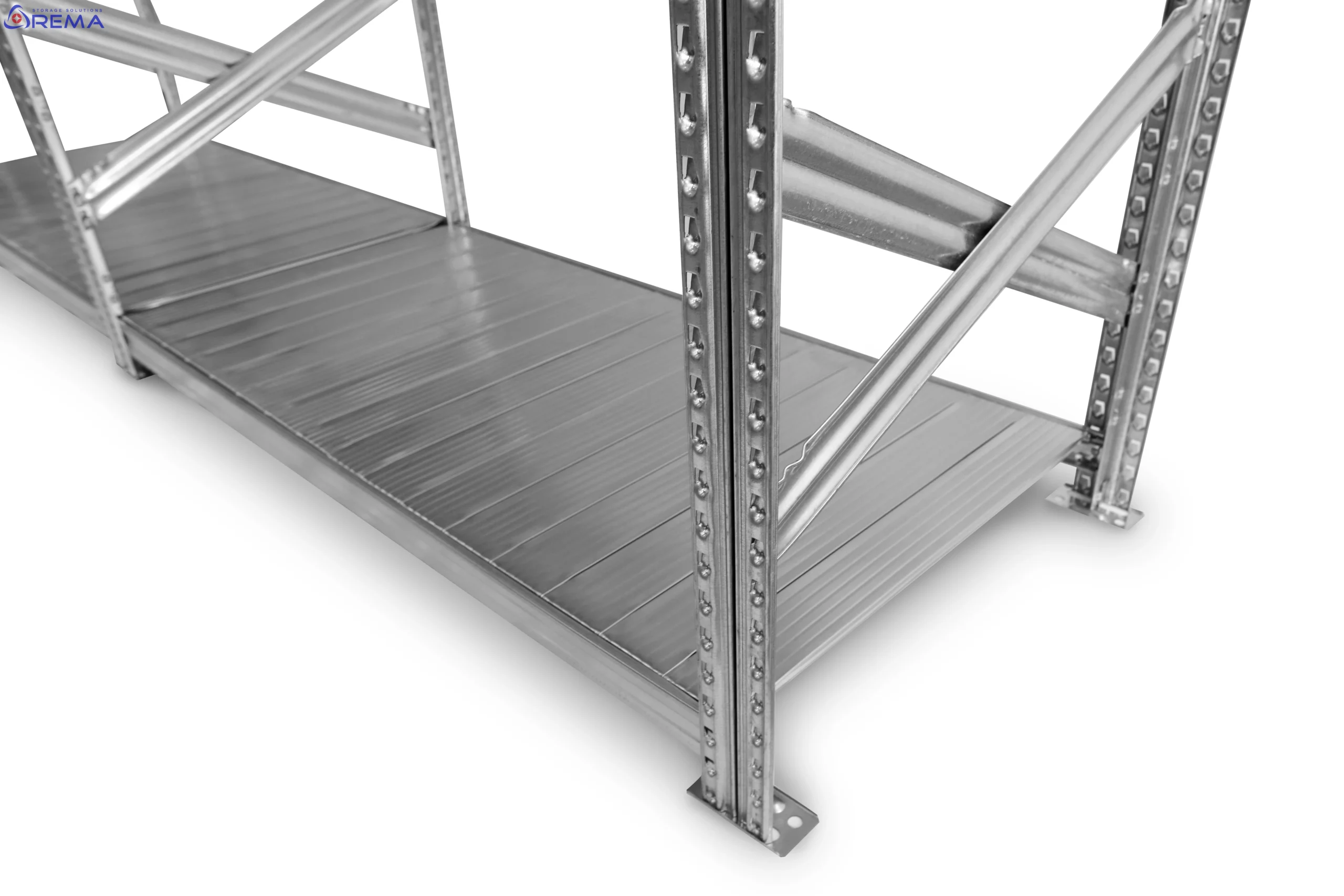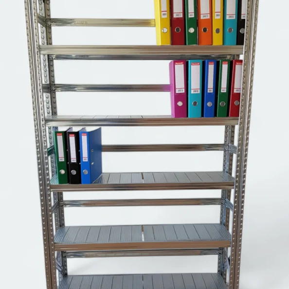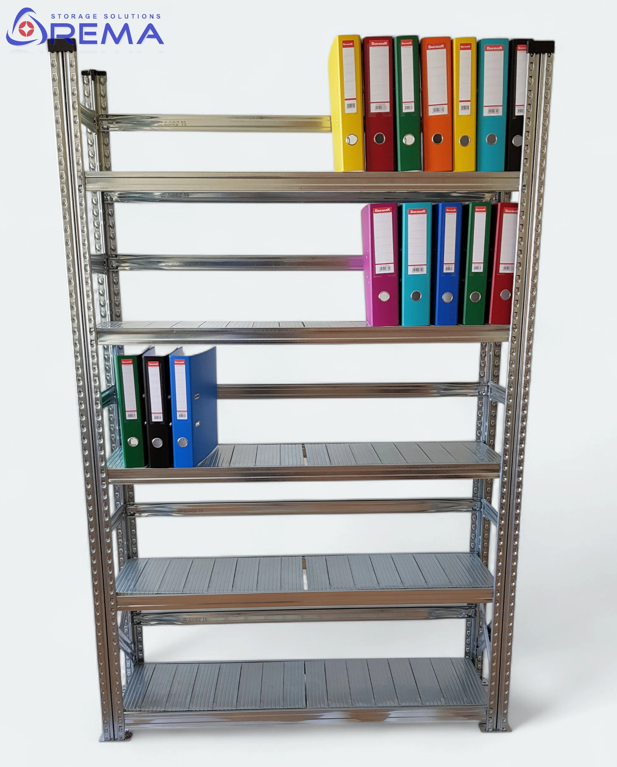 Wykonany w całości z ocynkowanej stali o wysokiej odporności na korozję, jest trwały, estetyczny i łatwy w utrzymaniu. Dzięki systemowi bezśrubowego montażu wtykowego, regał można złożyć lub przebudować w krótkim czasie – bez konieczności użycia specjalistycznych narzędzi.