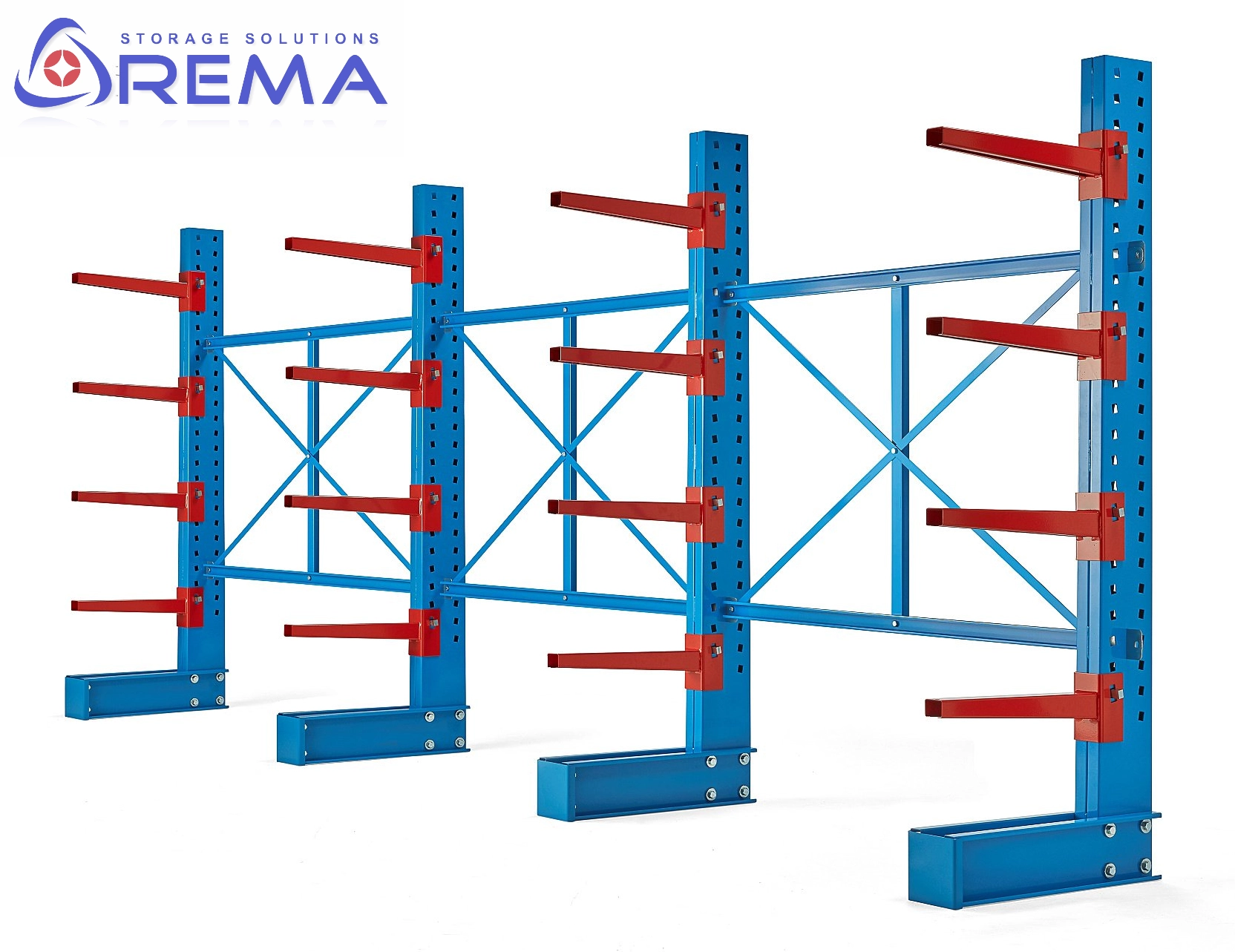 Każdy regał wspornikowy może zostać rozbudowany o dodatkowe moduły, co pozwala tworzyć długie ciągi przechowywania.
