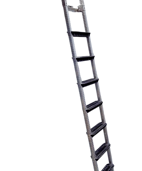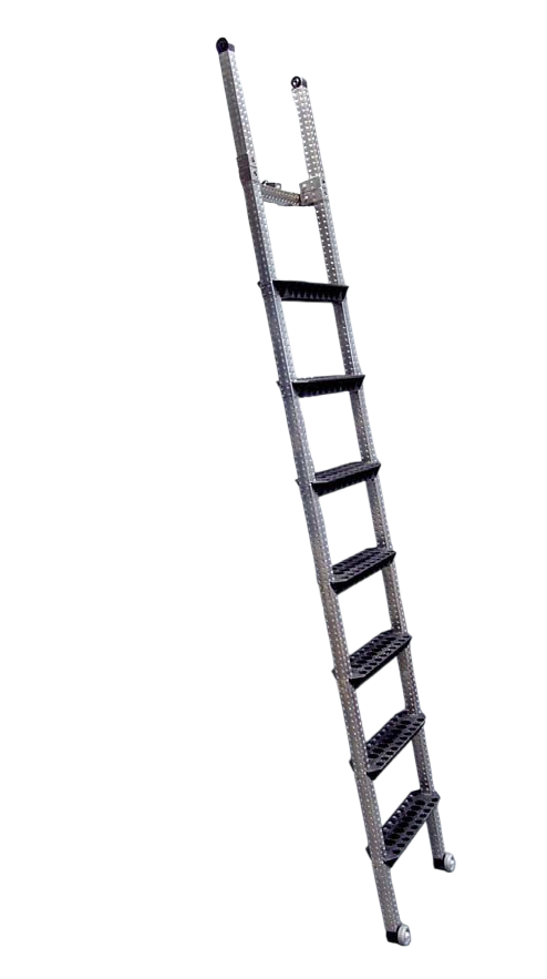 Drabina wyposażona jest w antypoślizgowe stopnie, solidne poręcze boczne oraz stabilne mocowania do prowadnicy górnej.