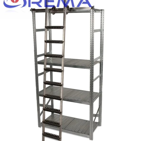 Zintegrowana drabina jezdna stanowi integralny element konstrukcji regału. Jej prowadnice montowane są do górnych belek regałów, umożliwiając płynne przesuwanie drabiny wzdłuż całego ciągu.