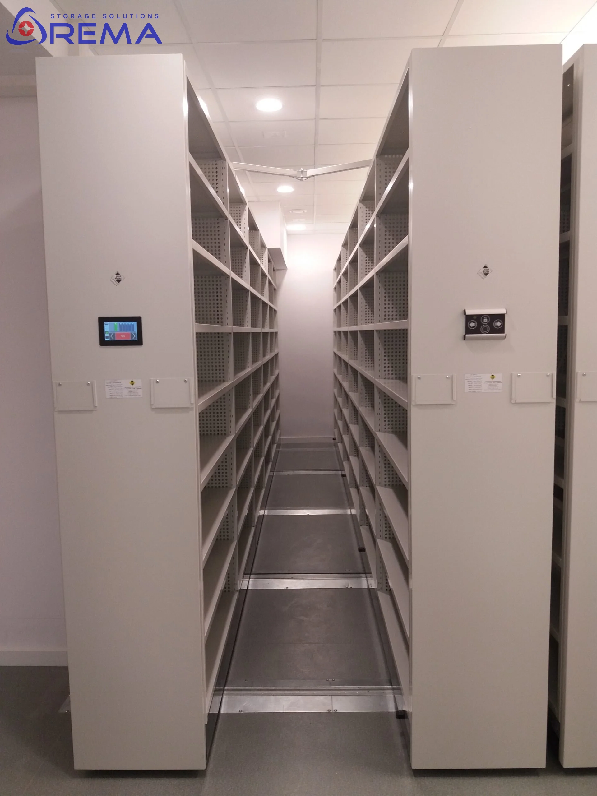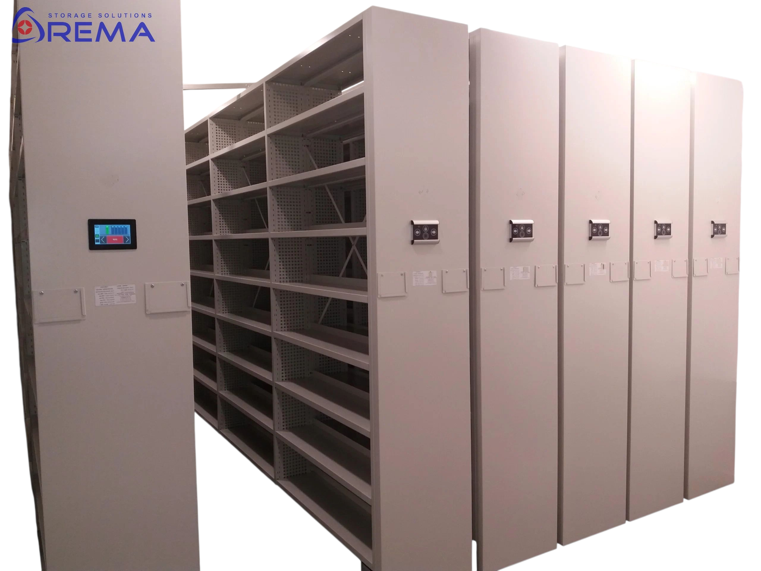 System Elektrycznych Regałów Przesuwnych stanowi nowoczesne uzupełnienie oferty tradycyjnych regałów jezdnych REMA, umożliwiając automatyczne otwieranie i zamykanie modułów bez użycia siły fizycznej. Dzięki inteligentnemu sterowaniu użytkownik może w pełni zarządzać systemem za pomocą panelu dotykowego LCD umieszczonego na froncie regału.