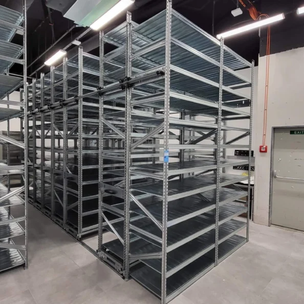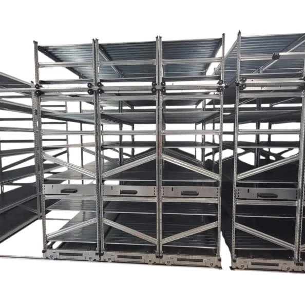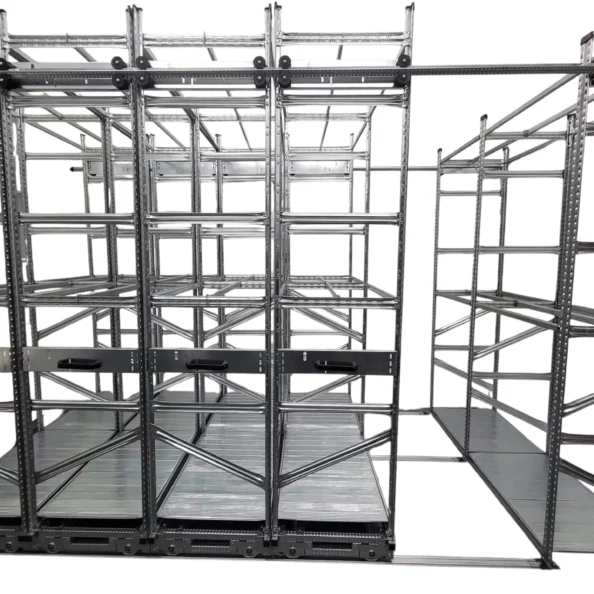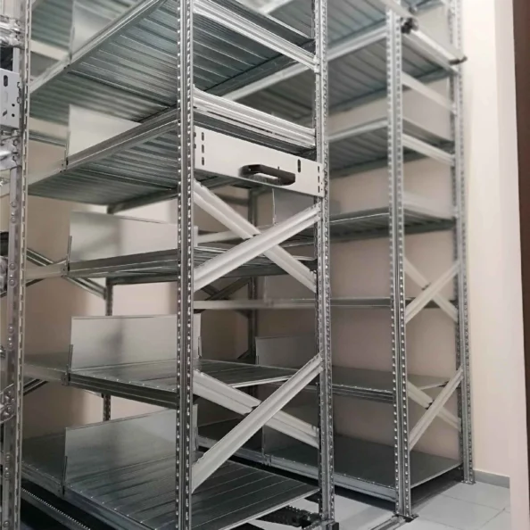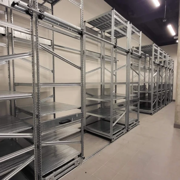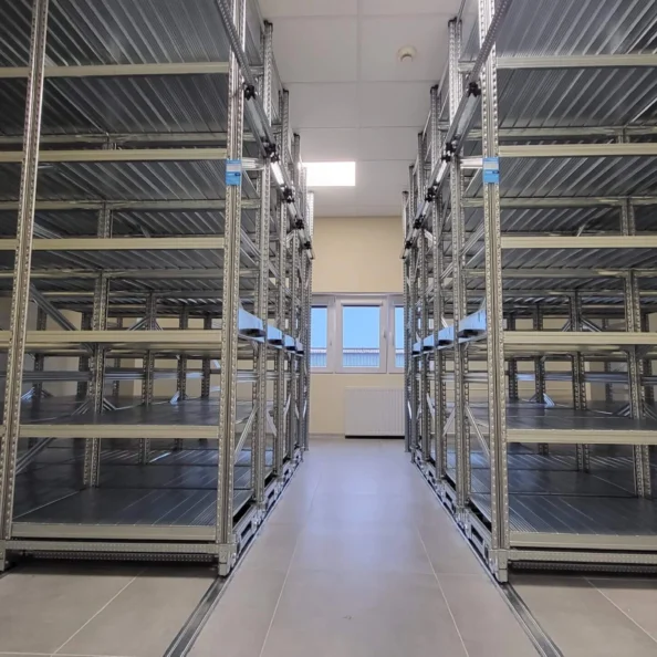 Konstrukcja regałów mobilnych magazynowych wykonana jest w całości z wysokogatunkowej stali cynkowanej, odpornej na wilgoć, korozję i uszkodzenia mechaniczne.