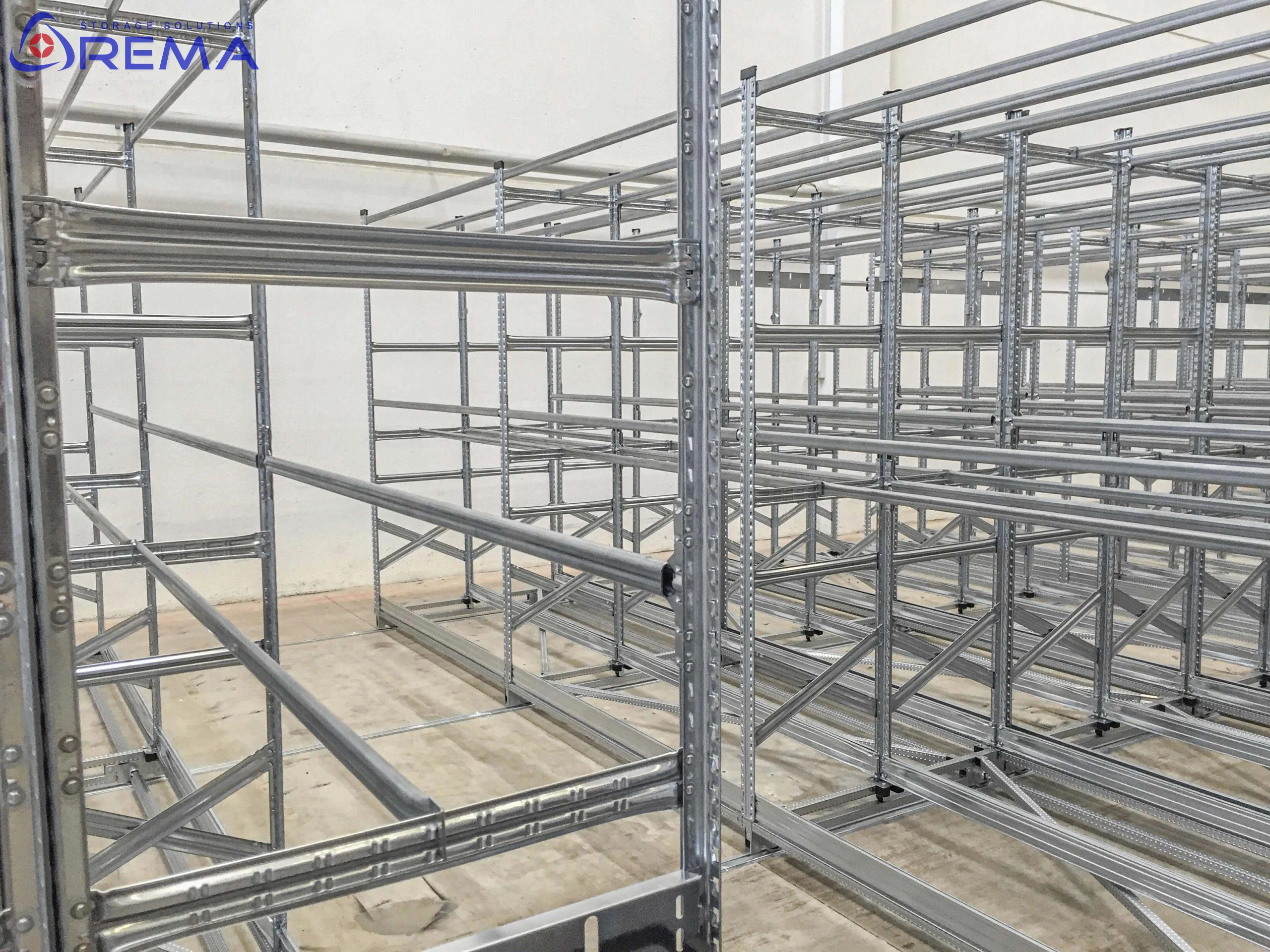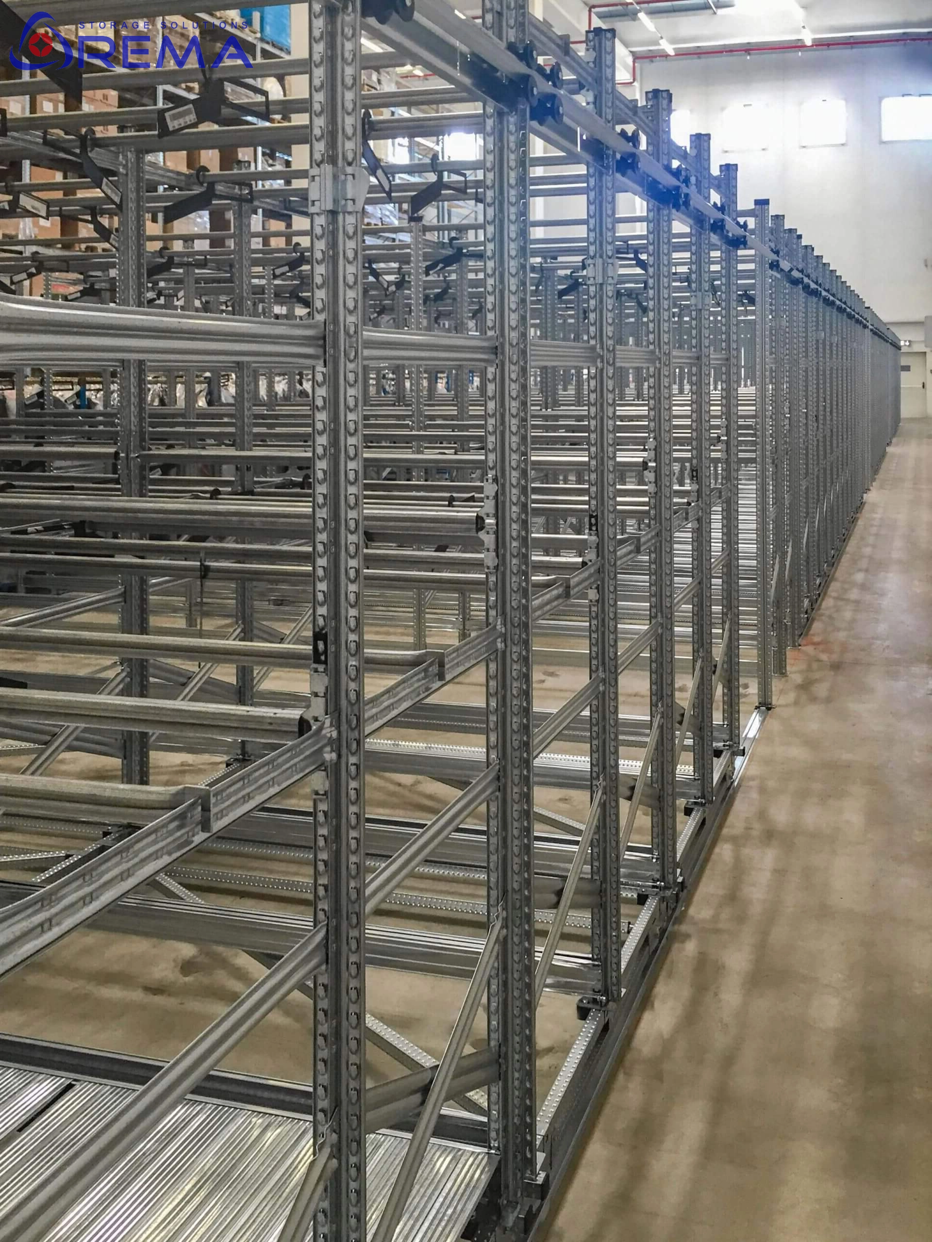 Konstrukcja regałów przesuwnych na odzież wykonana jest w 100% ze stali cynkowanej, co zapewnia im odporność na wilgoć, korozję i uszkodzenia mechaniczne.