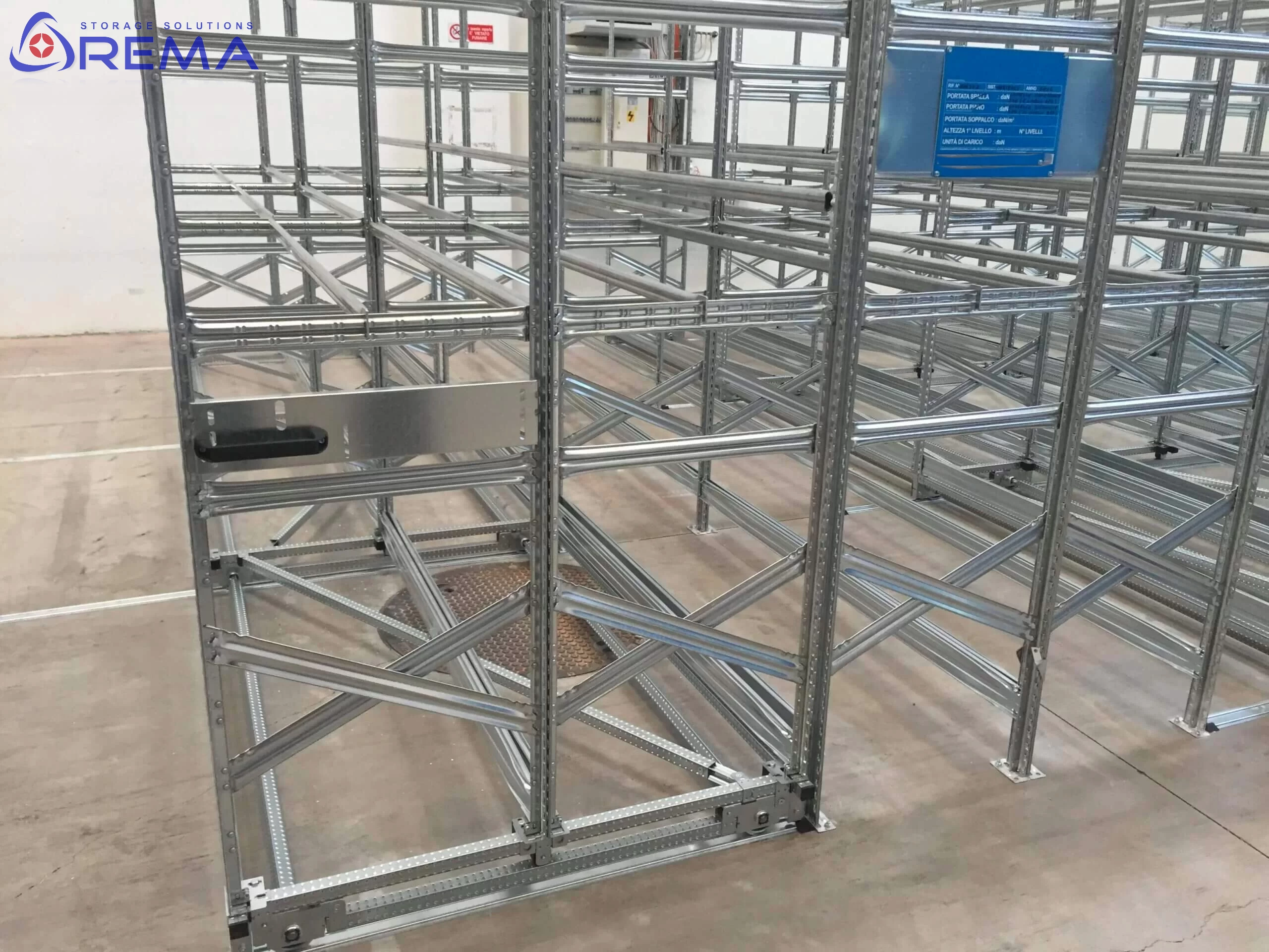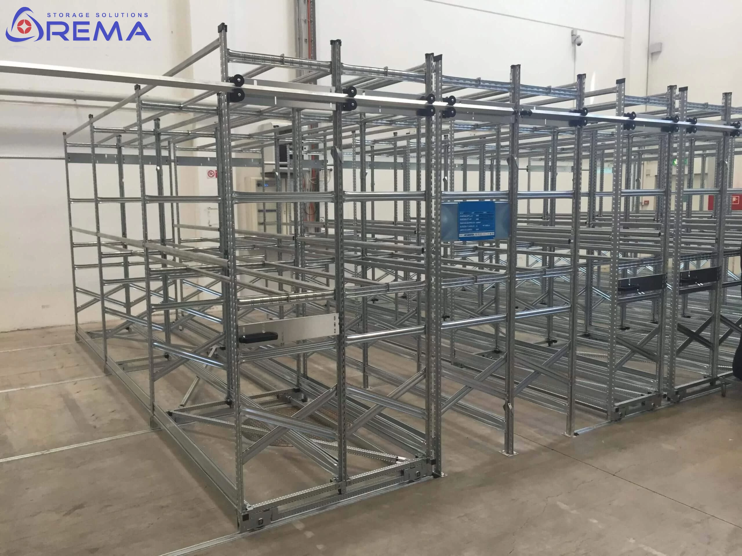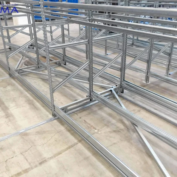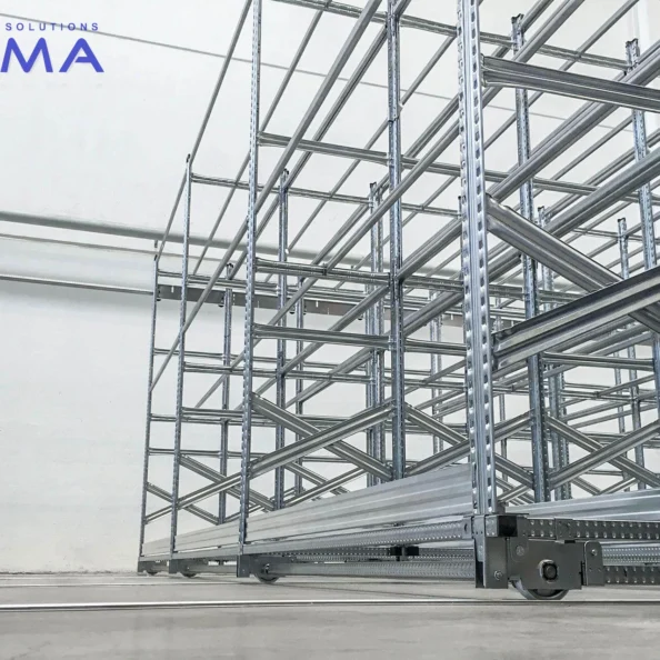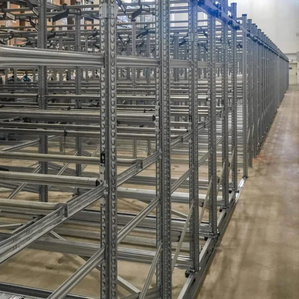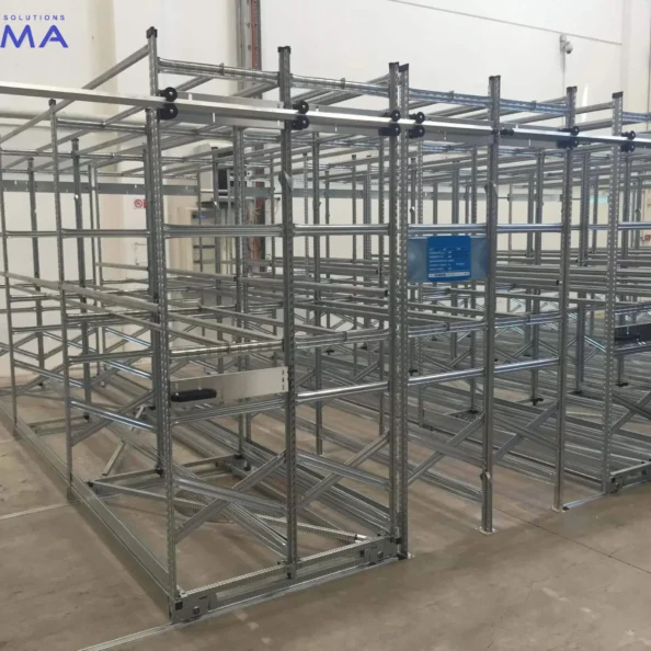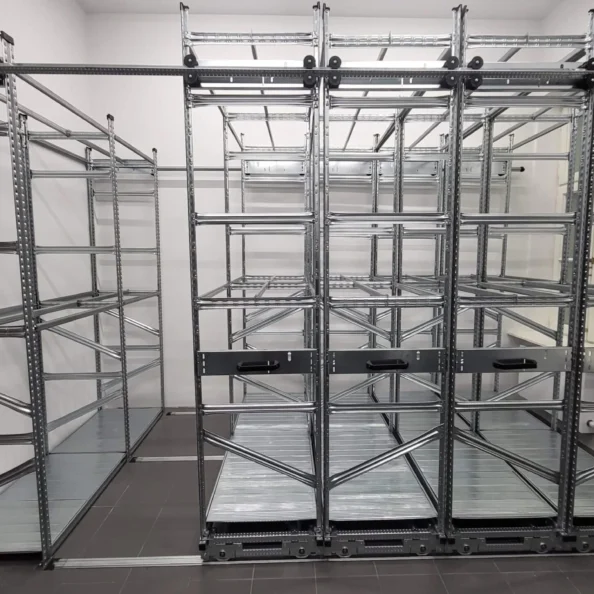 Każdy regał jest montowany na stabilnych wózkach jezdnych, które poruszają się po stalowych prowadnicach, zapewniając płynny, lekki i cichy przesuw.