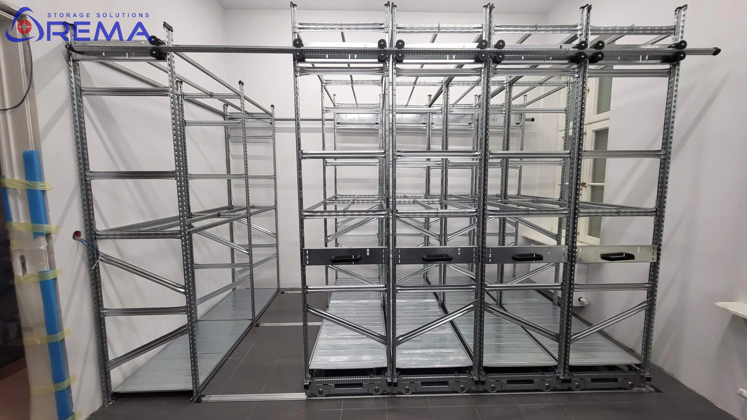 Dzięki mobilnemu systemowi regały można przesuwać po prowadnicach, otwierając dostęp tylko do wybranego segmentu, a pozostałe elementy pozostają zwarte i oszczędzają miejsce.
