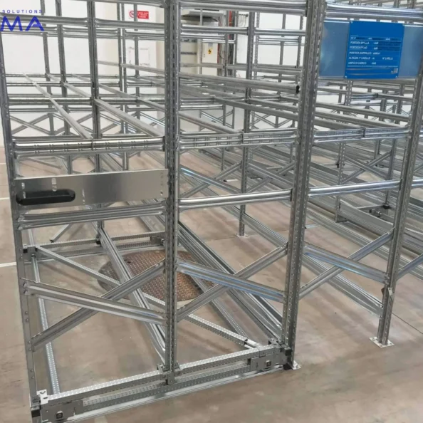Na jednym wózku można zamontować maksymalnie dwa regały, przy całkowitym obciążeniu do 1000 kg.
