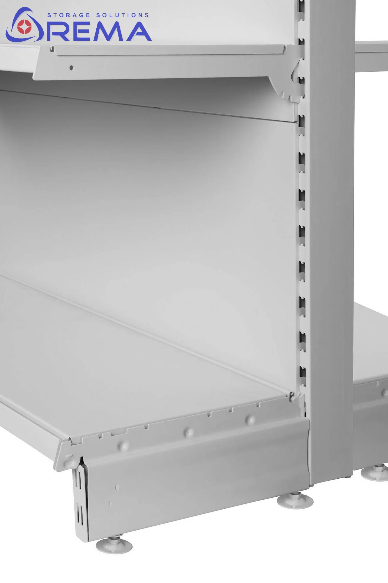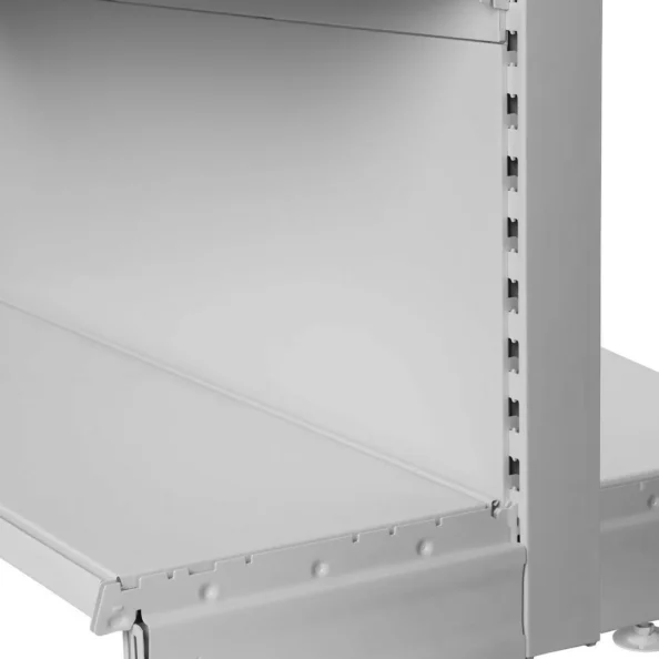Regały sklepowe dwustronne wykonujemy ze stali zimnowalcowanej. Materiał ten cechuje się wysoką odpornością na obciążenia mechaniczne. Słupy perforowane są dodatkowo wzmacniane, a półki mogą być poddane procesowi gięcia dla zwiększenia ich nośności.