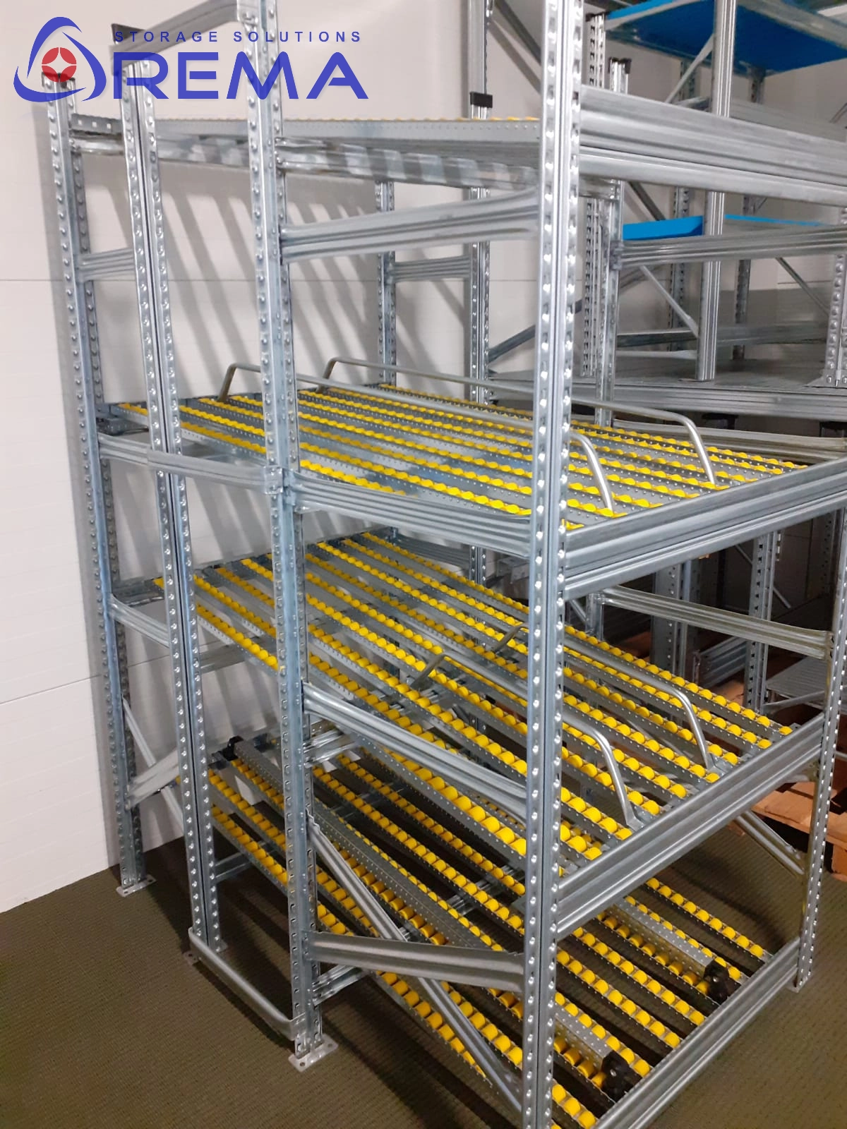 Regał grawitacyjny ocynkowany jest odporny na wilgoć, skraplanie, różnice temperatur. Dlatego można go ustawić również w chłodniach lub mroźniach jako regały do chłodni.