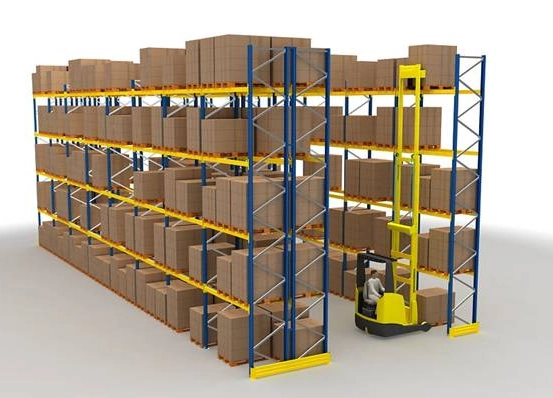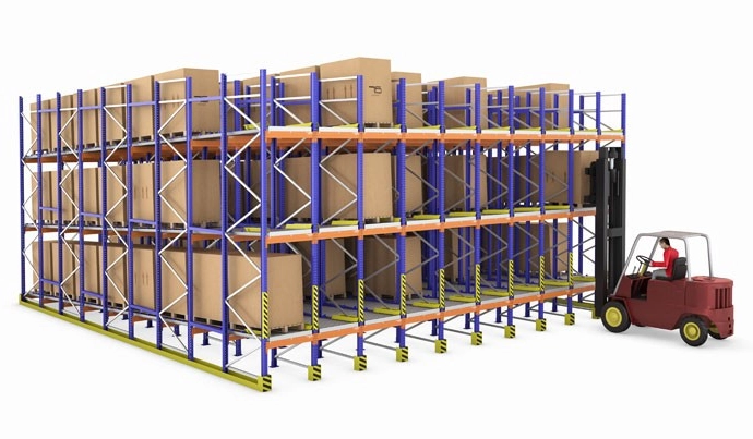 To systemy, w których palety składowane są na szynach nośnych, a wózek wjeżdża bezpośrednio do gniazda regałowego.