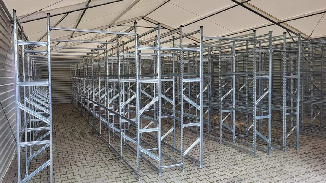Pozwala na tworzenie stabilnych struktur nawet tam, gdzie nie ma możliwości kotwienia – np. właśnie na kostce brukowej. Dotyczy to zarówno systemy regałów na opony bez wypełnień półkowych, regałów do chłodni z półkami mrozodpornymi i regałów półkowych litych i perforowanych.