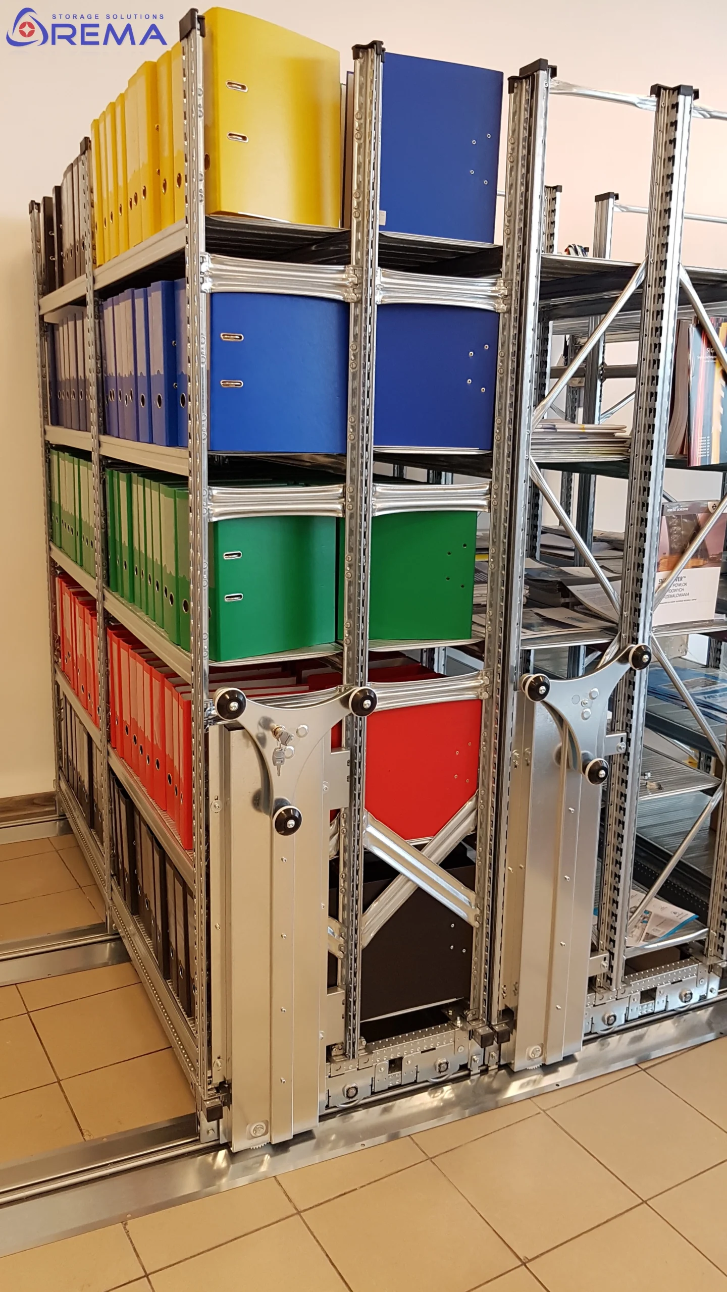 Archiwa i biura – do przechowywania dokumentów, akt i segregatorów w regałach jezdnych archiwalnych.