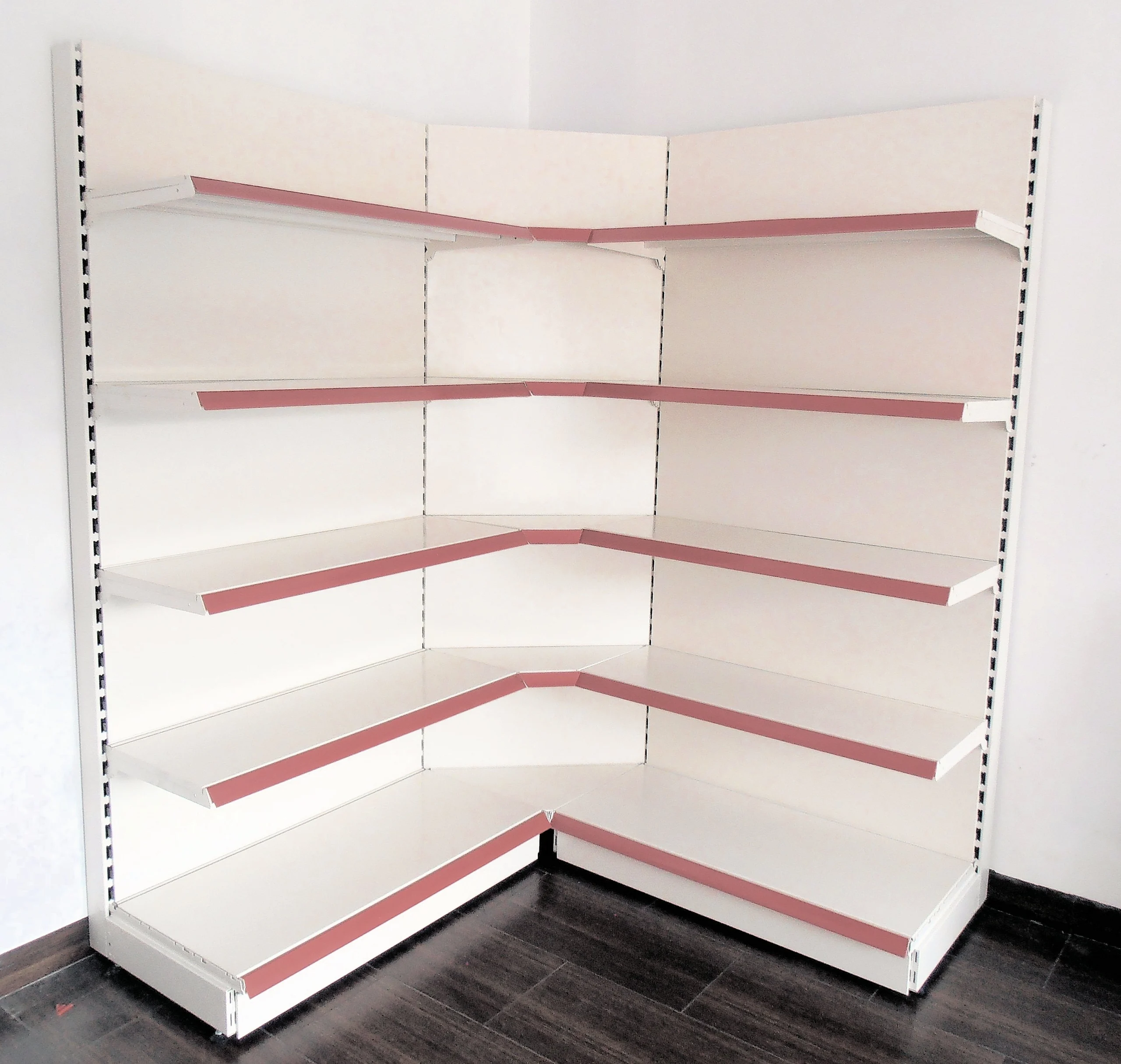 W strefach sprzedaży detalicznej często stosuje się regały sklepowe narożne, w których półki ustawione są pod kątem 45° względem dwóch przylegających regałów.